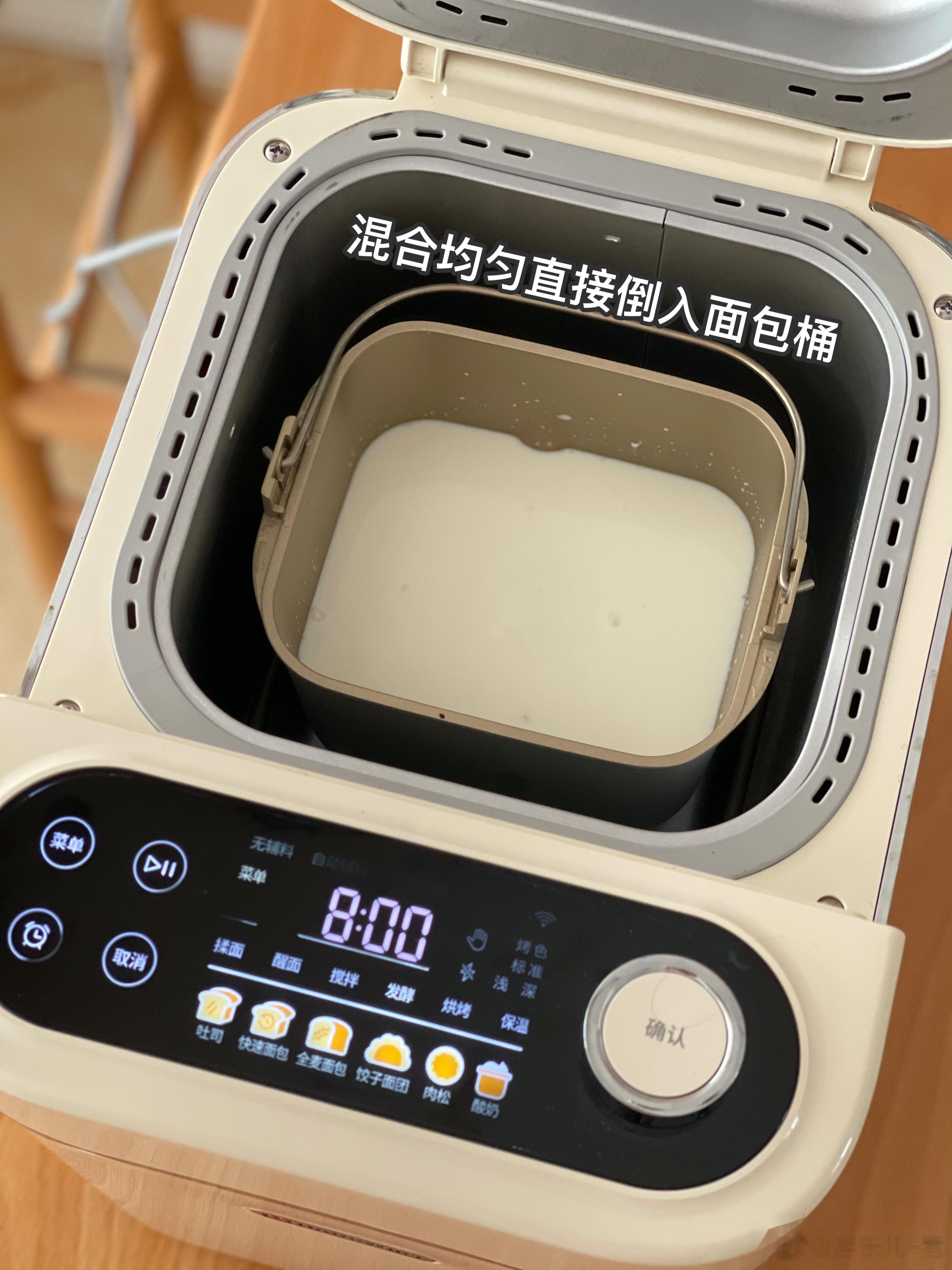 2.面包桶用沸水烫一下晾干,把温热好的牛奶倒进去,再把剩余牛奶和淡奶油加入混合,最后加入菌粉充分拌匀(怎么叫充分呢,停止搅拌,表面没有浮着的菌粉即可)。