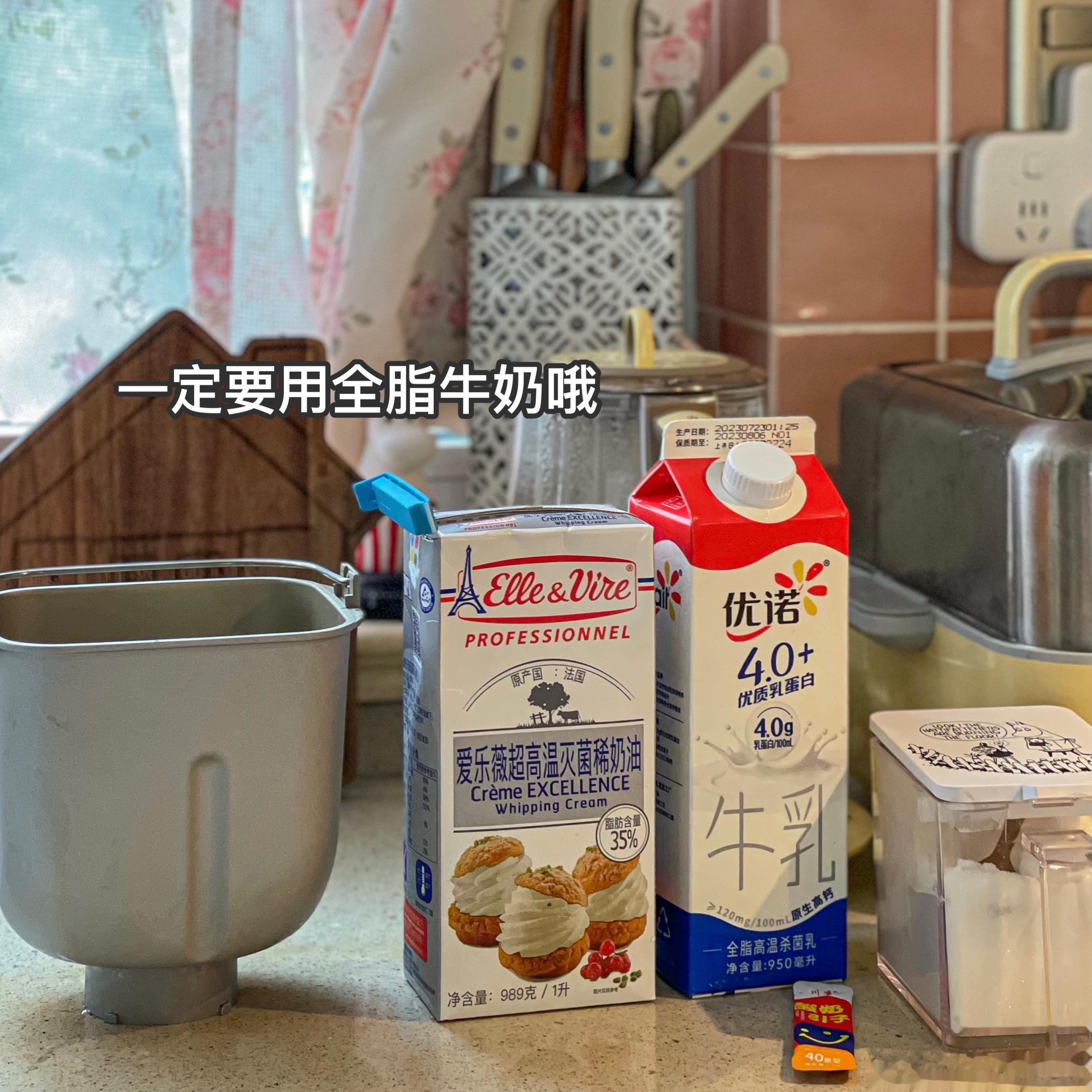 食材:全脂牛奶(冷藏那种鲜奶)900克,淡奶油100克,糖20克(这里可以不加,就是无糖酸奶啦),菌粉一小包(我用的川秀这个牌子)。