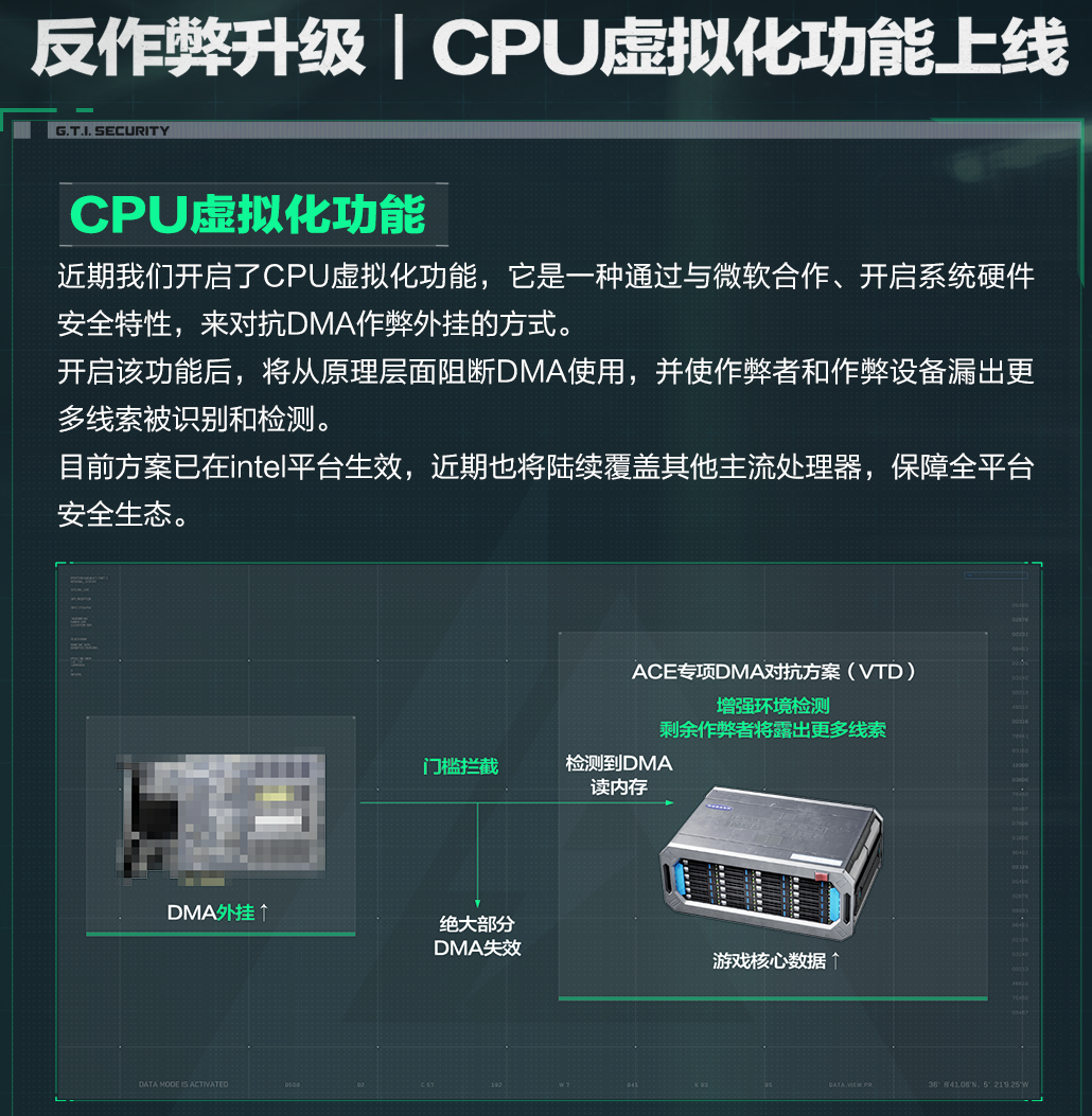 就比如今年7月份三角洲与微软合作,首创了CPU虚拟化功能,以此来对抗DMA作弊的外挂方式,开启该功能后,就能从原理层面阻断DMA使用,从而让外挂无法改写内存,并使作弊者和作弊设备暴露出更多线索被识别和检测。