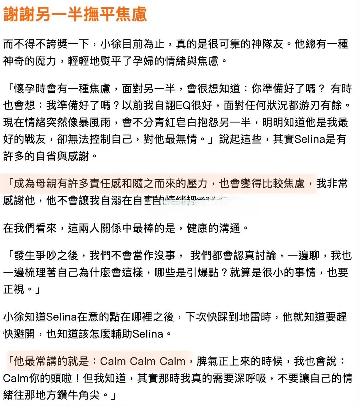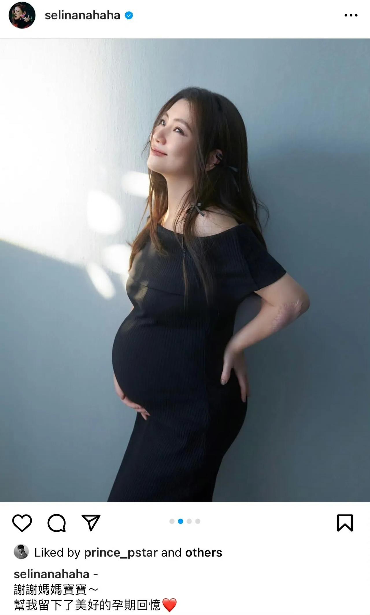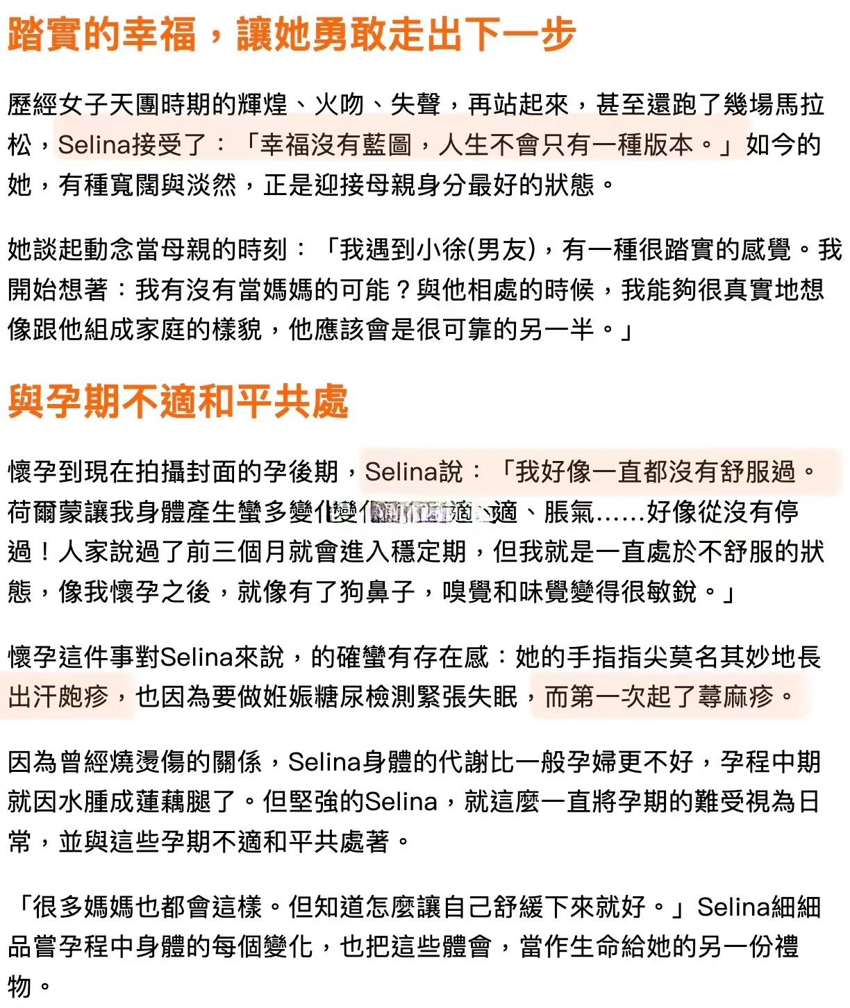 Selina为《妈妈宝宝》拍摄大肚照! 孕后期的Selina为《妈妈宝宝》拍摄了一组孕肚封面大片! 照片中的Selina明显胖了一些,满脸笑容充满着母性的柔美! 在采访中谈及怀孕的状态,也会焦虑也会担心也会有很多麻烦,但是依然很幸福很美好!