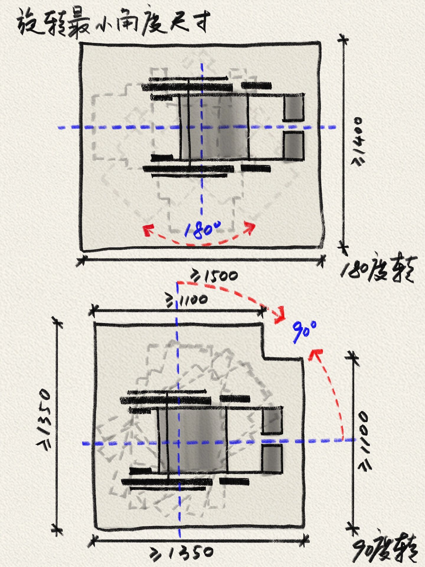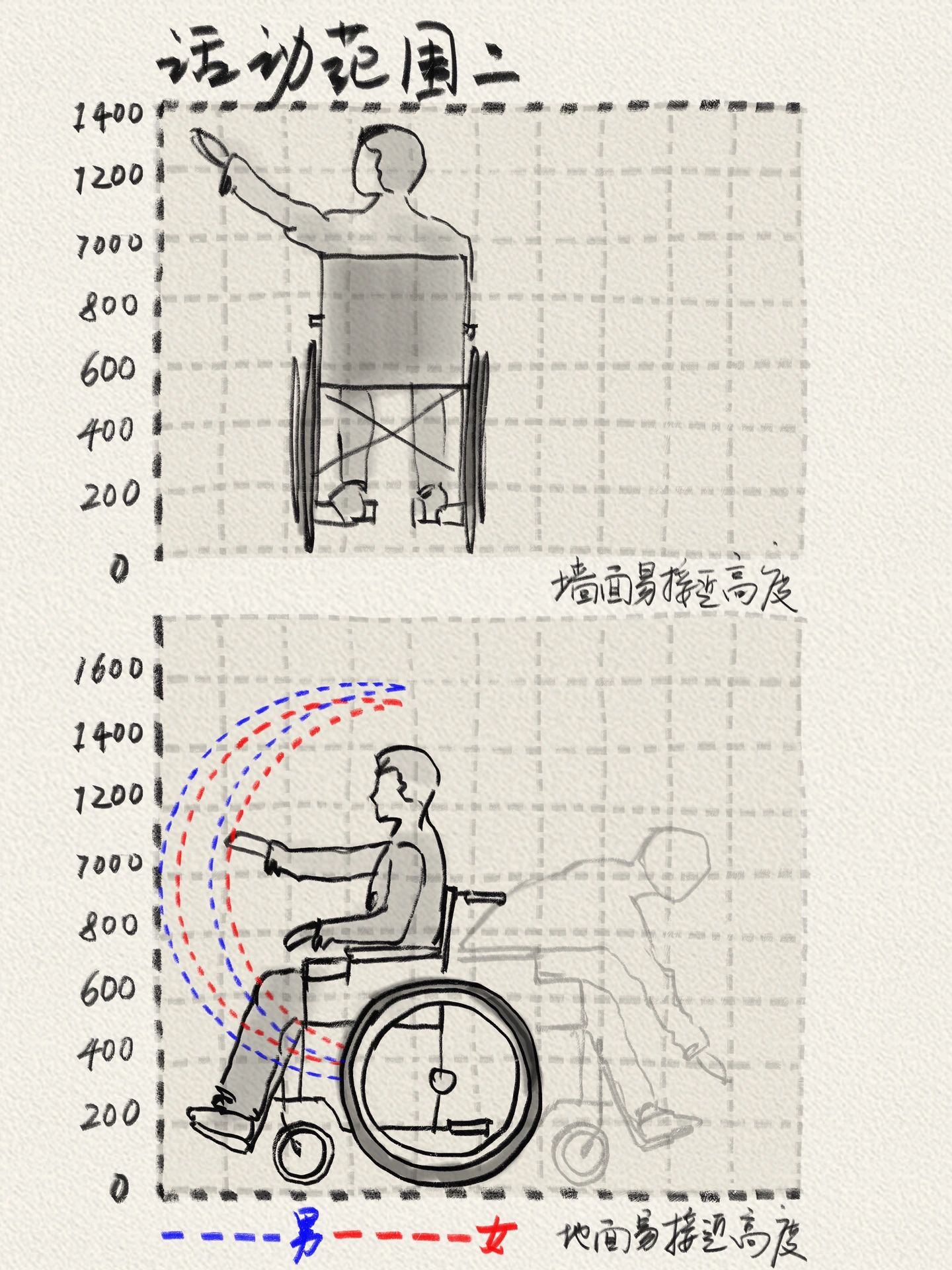 手稿标注尺寸按国家建筑标准规范 轮椅尺度请参考规范一 轮椅中的伸展范围幅度 范围幅度按规范中最小尺寸 高度按舒适范围 无障碍设施的规范通识 希望大家可以更好的 安排自己的生活与工作