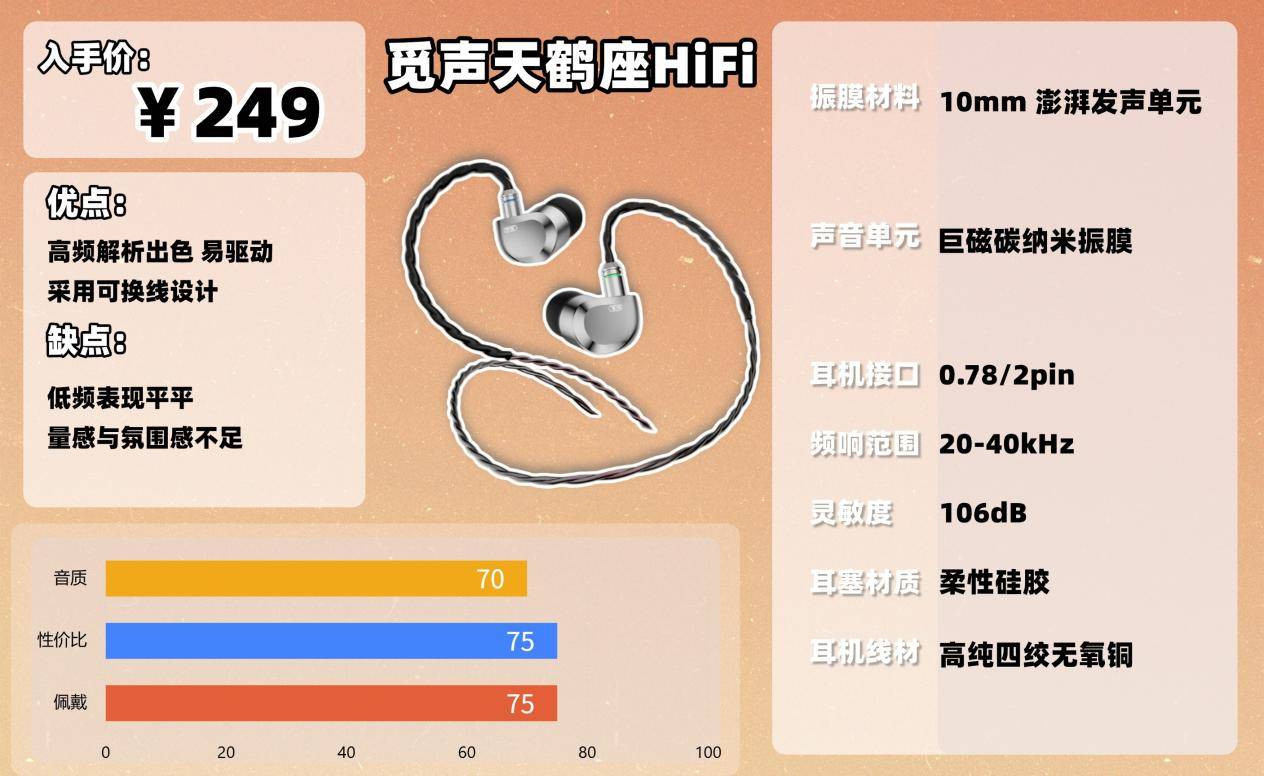 从多方的试听反馈来看,高频解析确实是天鹤座比较突出的部分,细节量比较丰富,听一些器乐类内容时能感受到较清晰的层次。中频属于比较稳的类型,人声不算厚,但整体挺规整。整体音色偏干净,没有多余的拖尾,属于比较直接的听感。