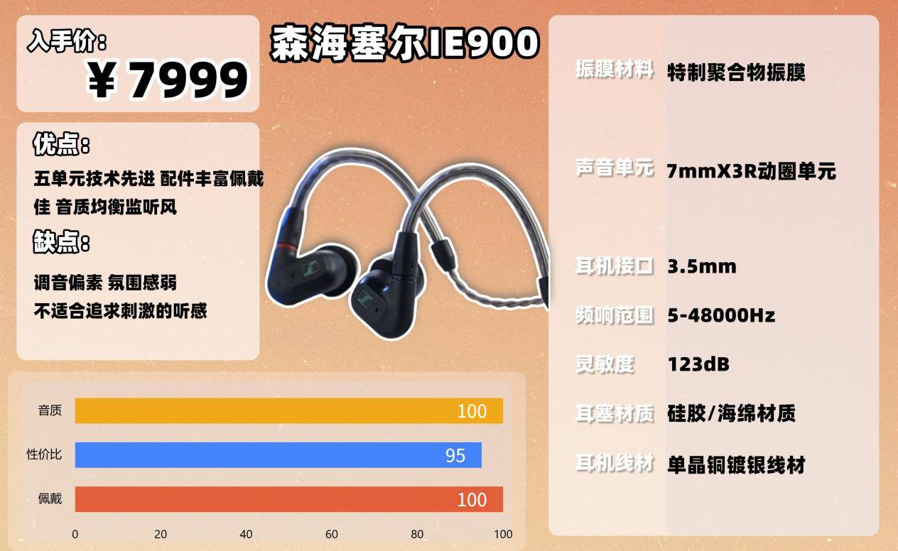 实际听感中,IE900 的声场宽度和层次感确实会给人留下比较深刻的印象,尤其是古典类录音,它对大场景、乐器群的刻画非常稳。低频量感不夸张,但有力度和纹理,延展也干净;高频能量适中,不尖不刺,亮度适合长时间聆听。整体风格偏向开放、流畅,有一定的“音乐厅味”,但表现更倾向真实而不是刻意放大氛围。