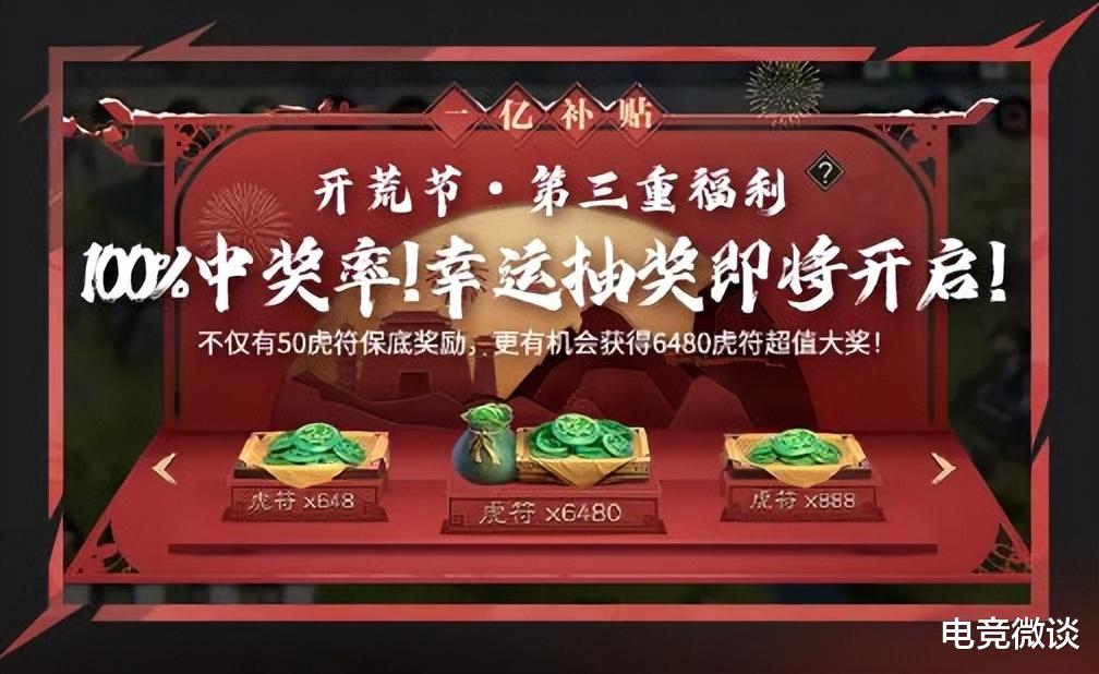 第三重福利,只要达成对应条件即可参与100%中奖率的幸运抽奖。不仅有保底50虎符的奖励,还有机会获得6480虎符的超值大奖。这就是白给呀,大家不管抽到什么,都是赚到哦~
