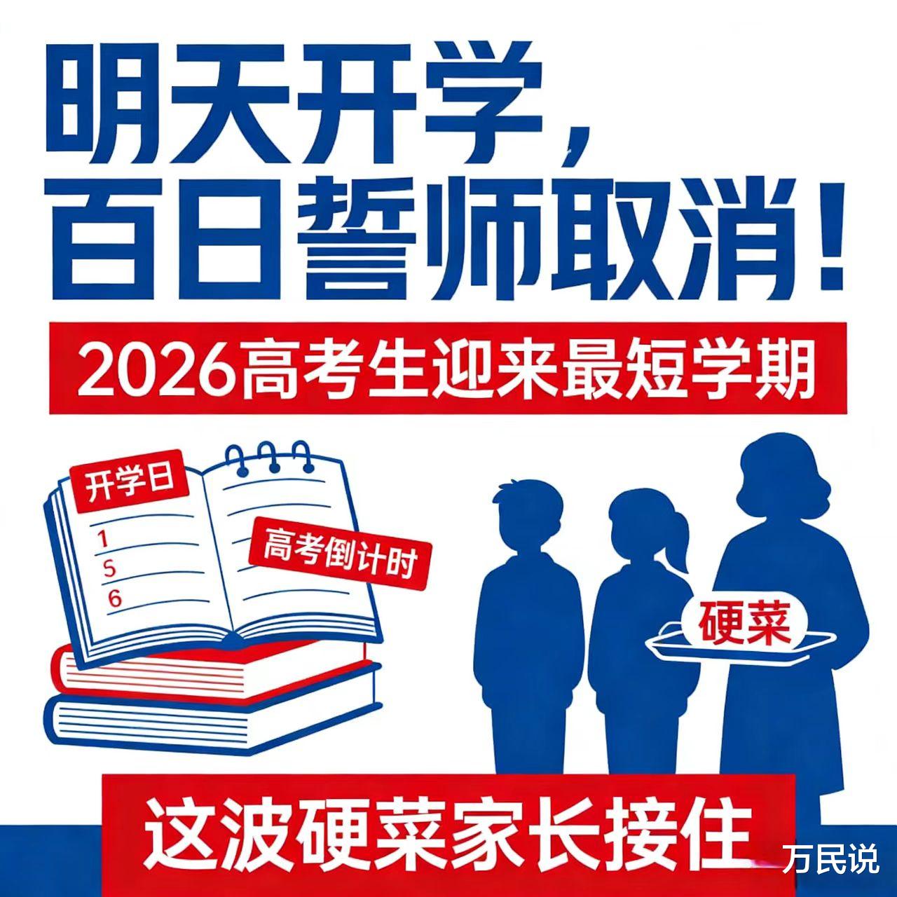 不少家长在群里问:孩子说学校没通知誓师大会,是不是就不办了?答案是:是的,很多学校都不搞了。一方面时间太紧——开学才三天就到“百日”,学生刚从假期模式切换过来,心还没收稳,一场热血誓师,效果有限;另一方面,教育风向也在变,更强调科学备考、心理健康,过度煽动反而容易让孩子压力过载、情绪崩盘。所以,别等誓师了。接下来,全是硬菜。