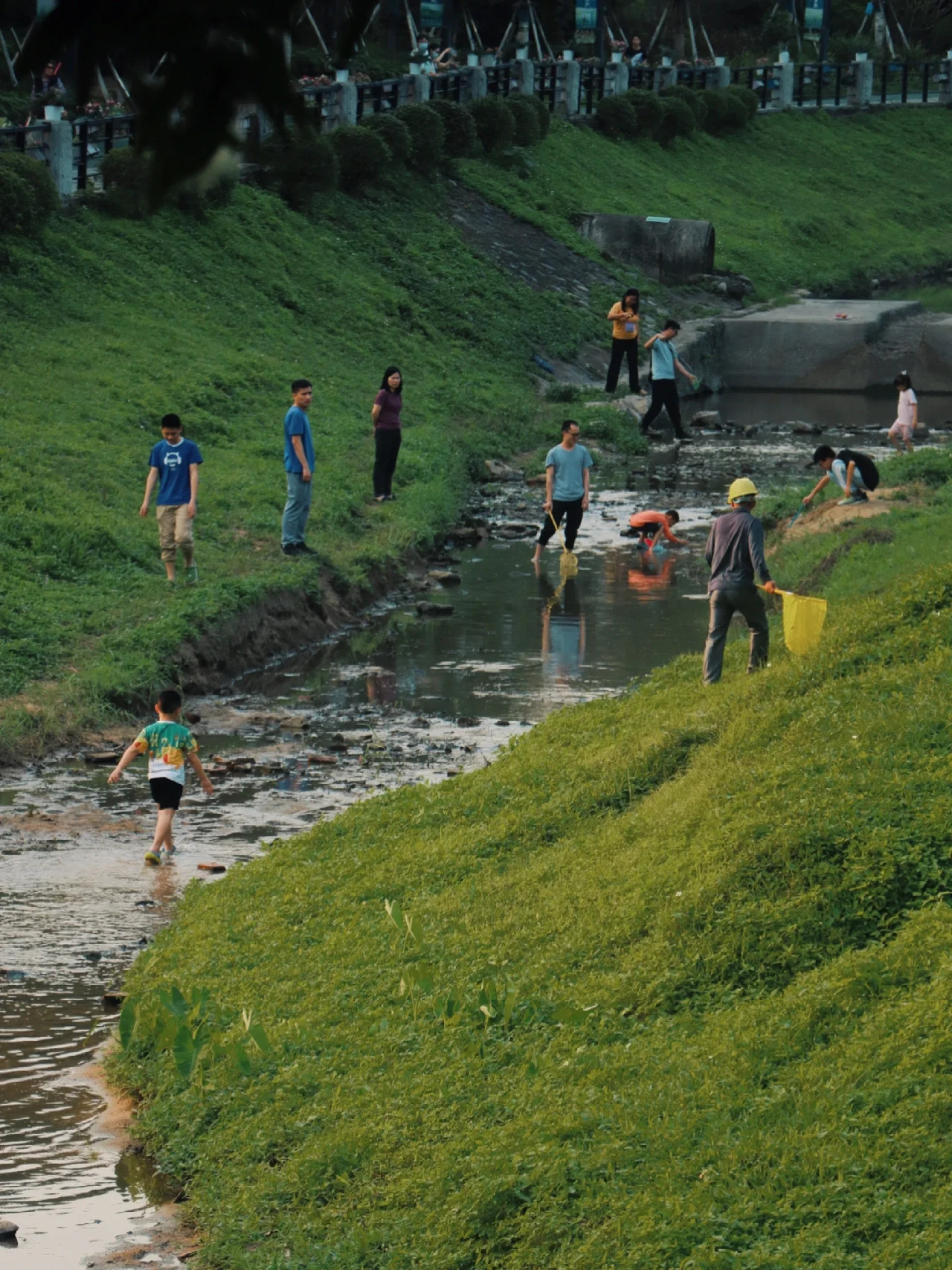 (1)一个是靠近地铁线路比较近的,那个小湿地公园。小湿地公园会有很多小孩子拿着捕鱼网捞着小鱼玩儿。