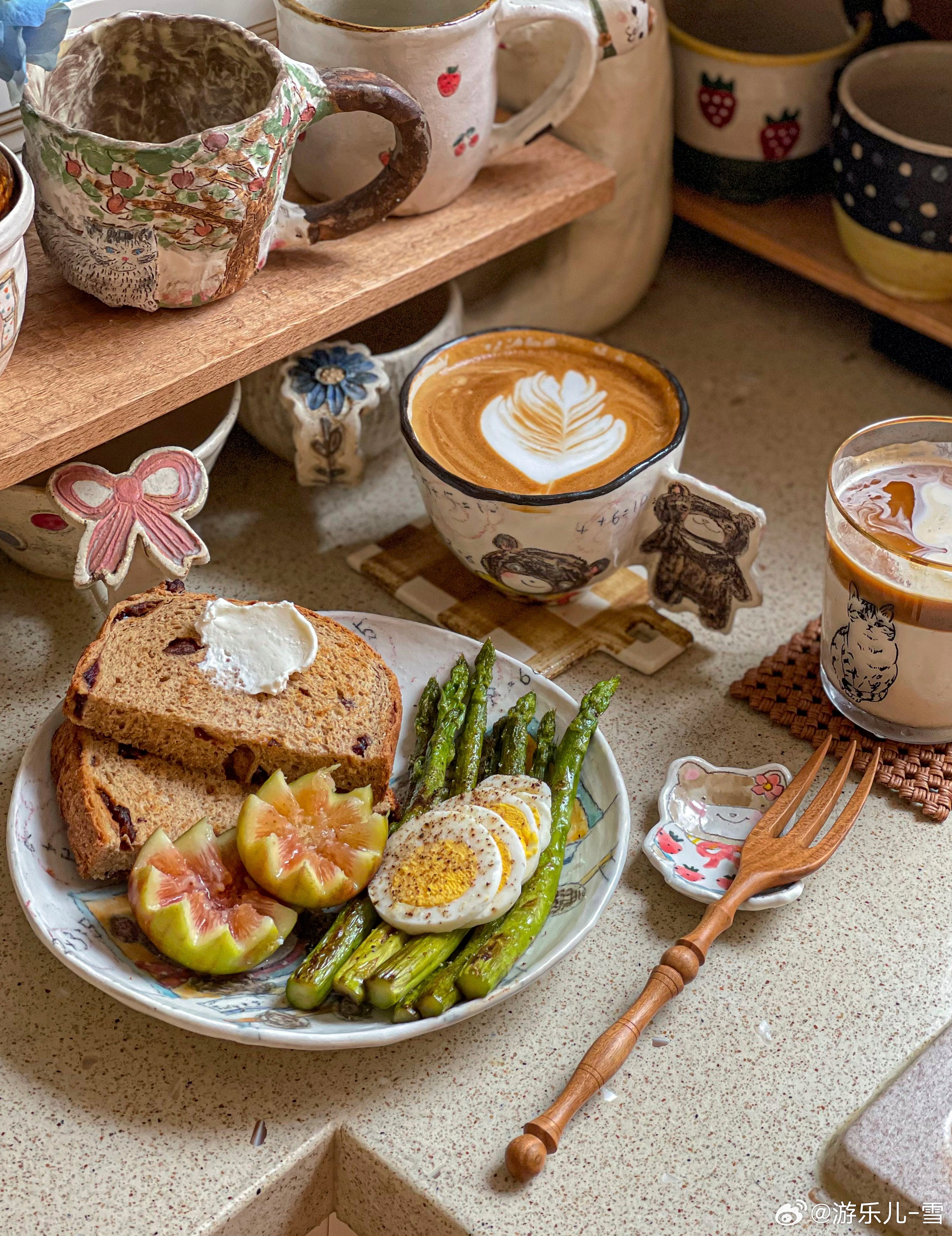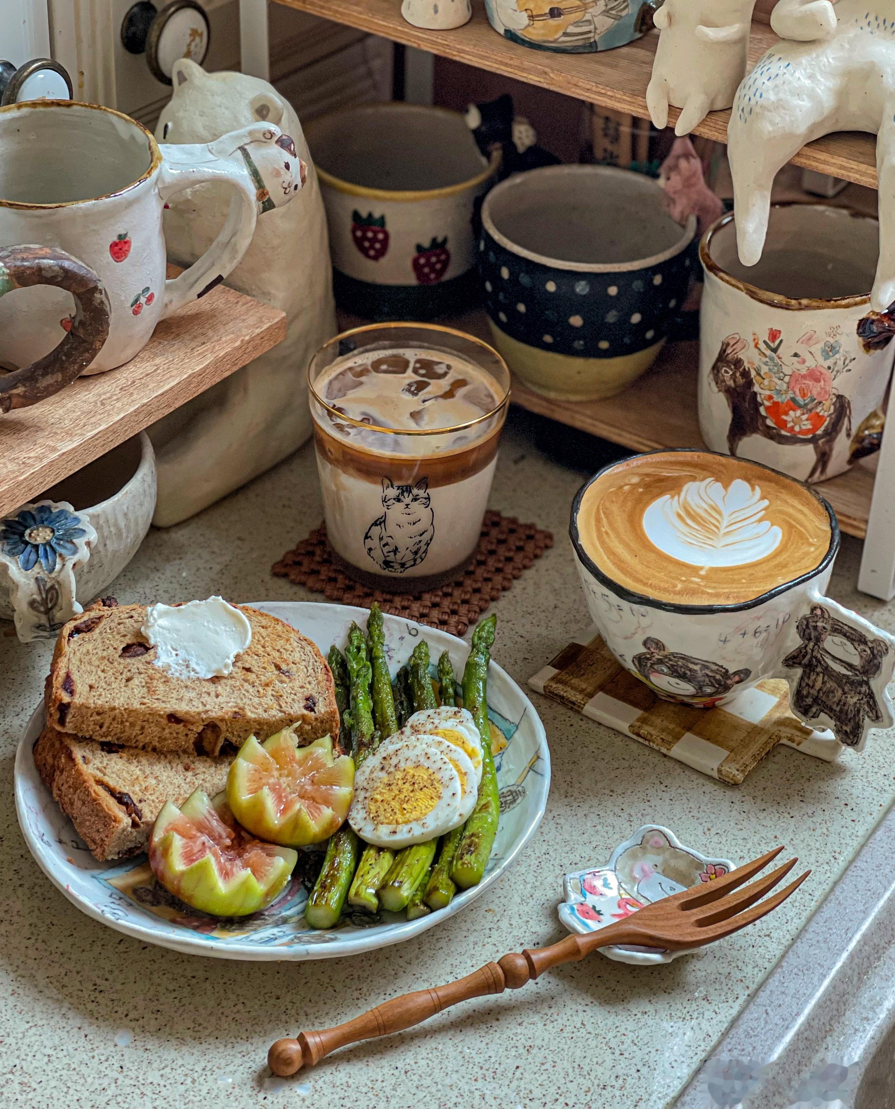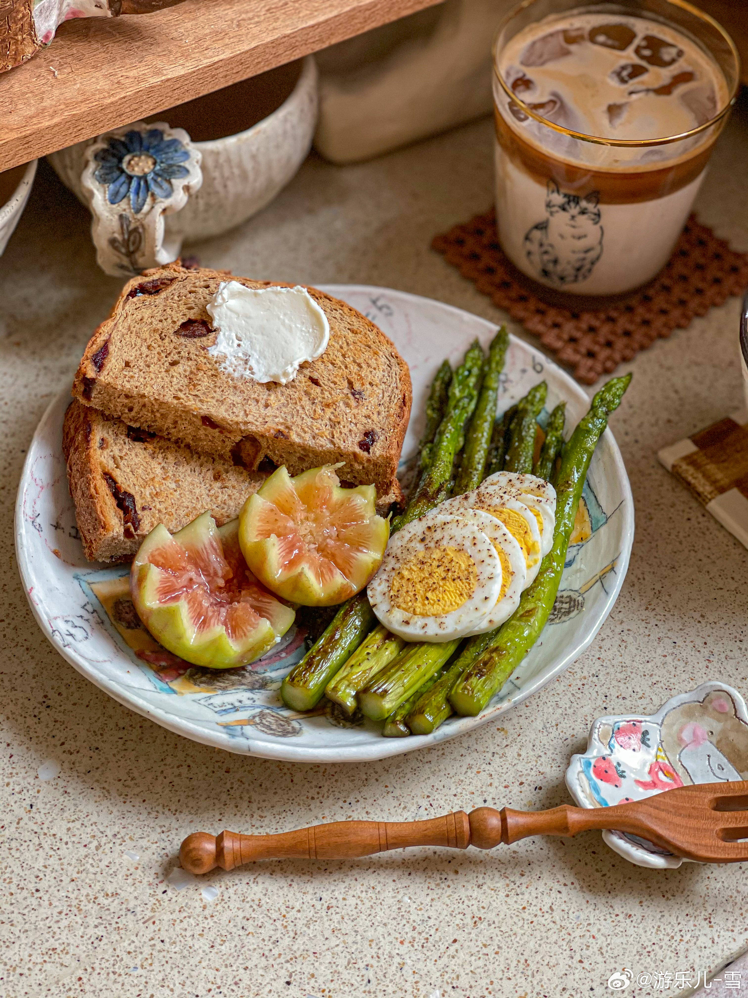 早餐是低脂:全麦吐司+煎芦笋+白煮蛋+无花果+自制咖啡