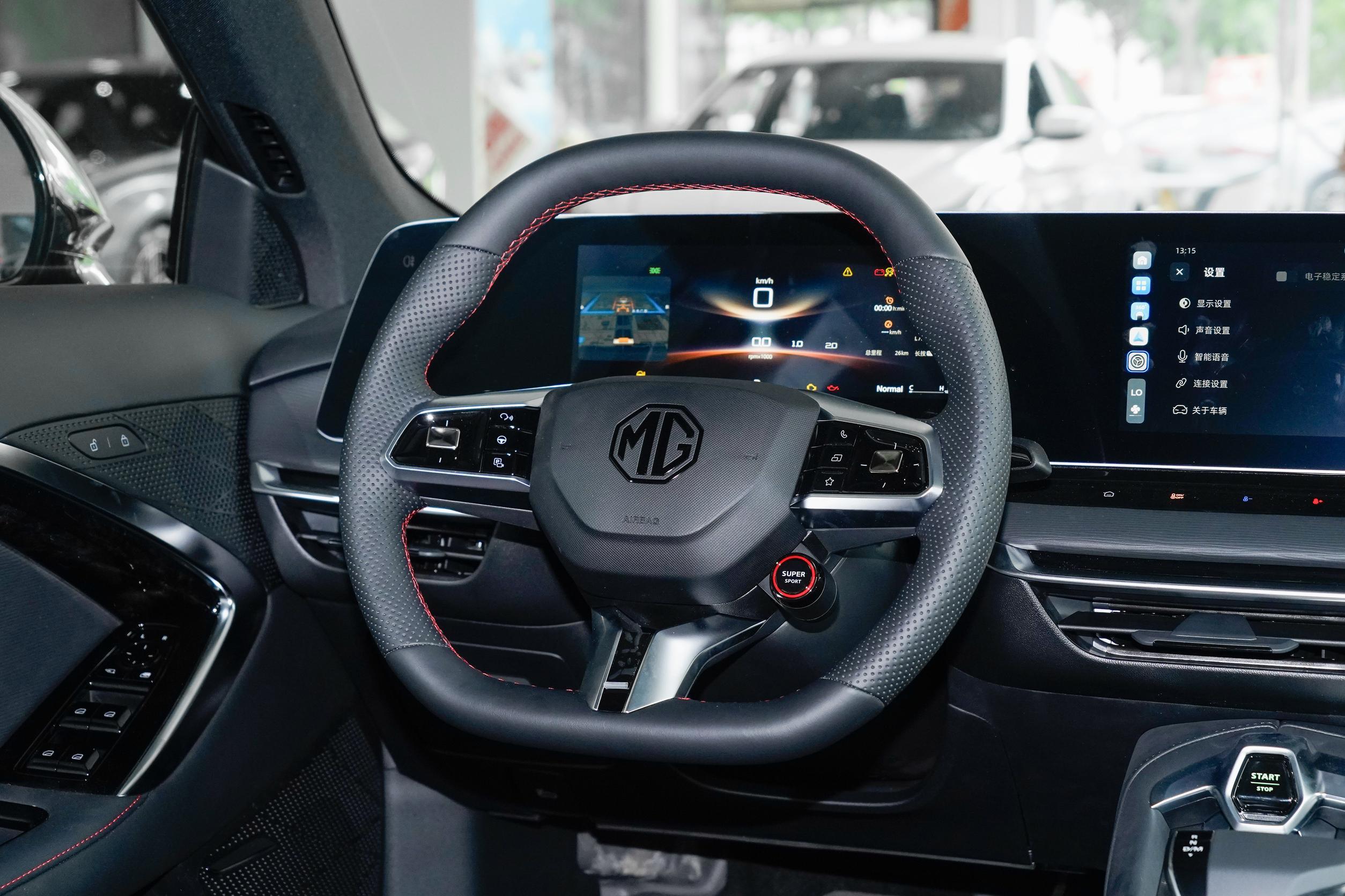 内饰部分,2025款MG7中控台使用双联屏布局,液晶仪表盘和中控屏尺寸分别为10.25英寸和12.3英寸,并配备有上下平底式方向盘以及电子换挡杆。