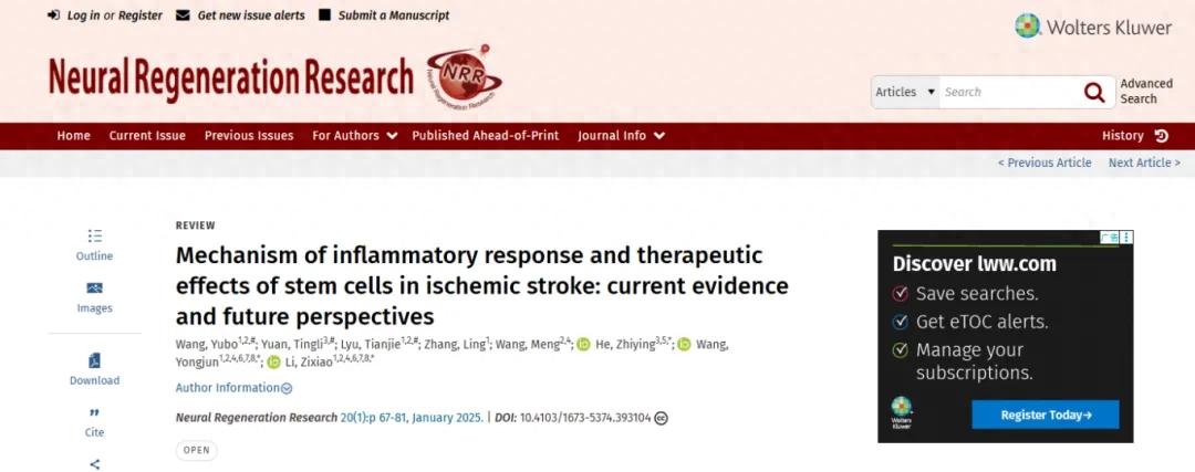 [6] Wang, Yubo1,2; Yuan, Tingli3; Lyu, Tianjie1,2; Zhang, Ling1; Wang, Meng2,4;He,Zhiying3,5;Wang,Yongjun1,2,4,6,7,8; Li, Zixiao1,2,4,6,7,8. Mechanism of inflammatory response and therapeutic effects of stem cells in ischemic stroke: current evidence and future perspectives. Neural Regeneration Research 20(1):p 67-81, January 2025.