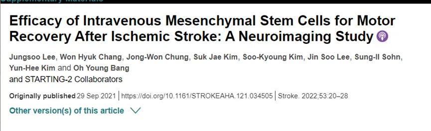 2021年9月,研究人员在Stroke杂志上发表了关于静脉注射间充质干细胞对缺血性脑卒中后运动恢复疗效的临床评估,通过神经影像学研究,证实了这种方法可以促进卒中后的运动恢复。