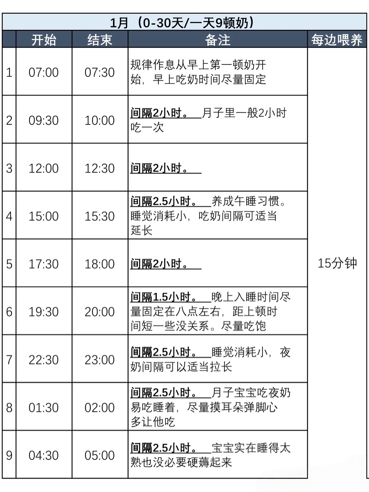 (这里插入你的图片,清晰展示各月龄的喂养时间、次数和每次喂养时长)