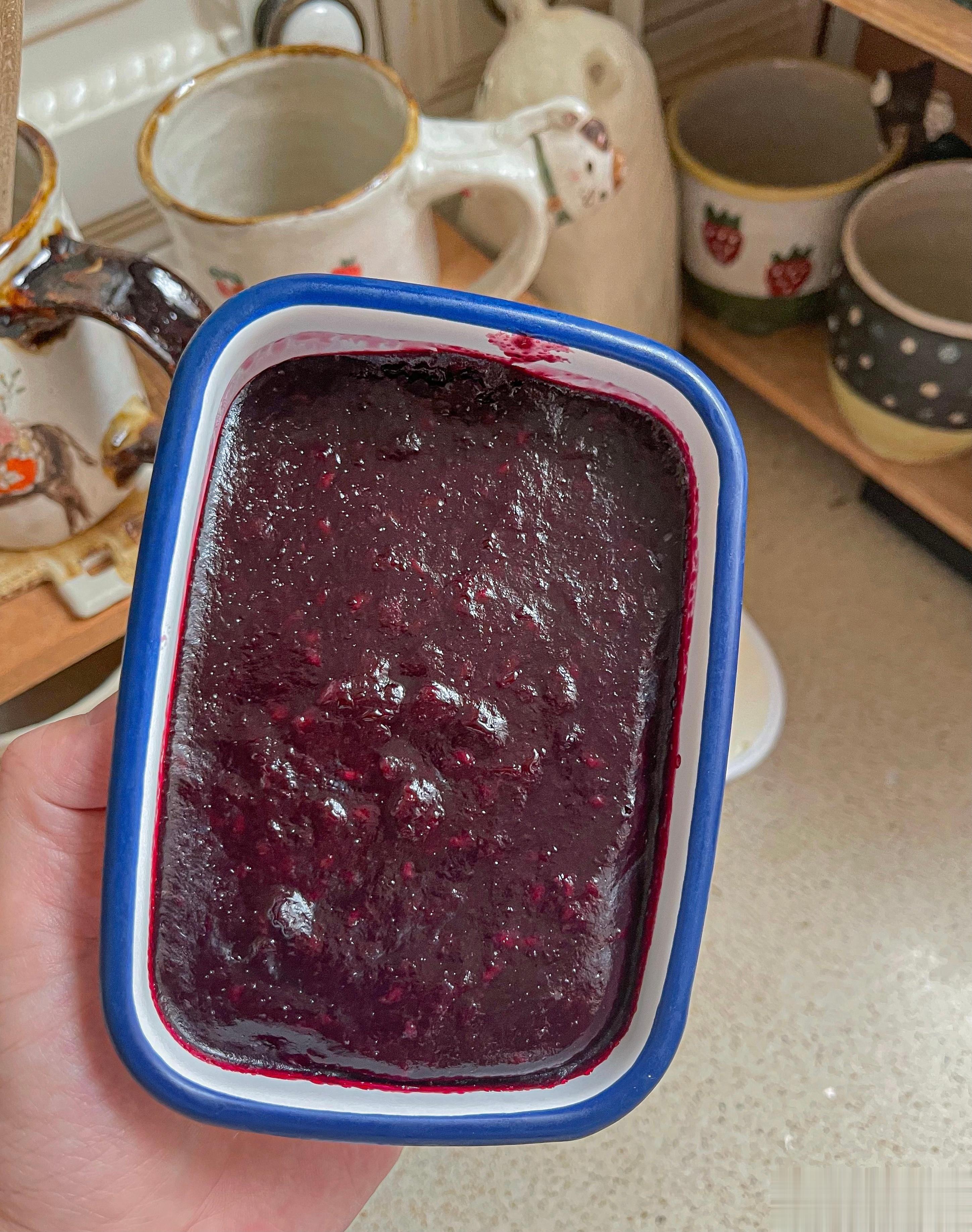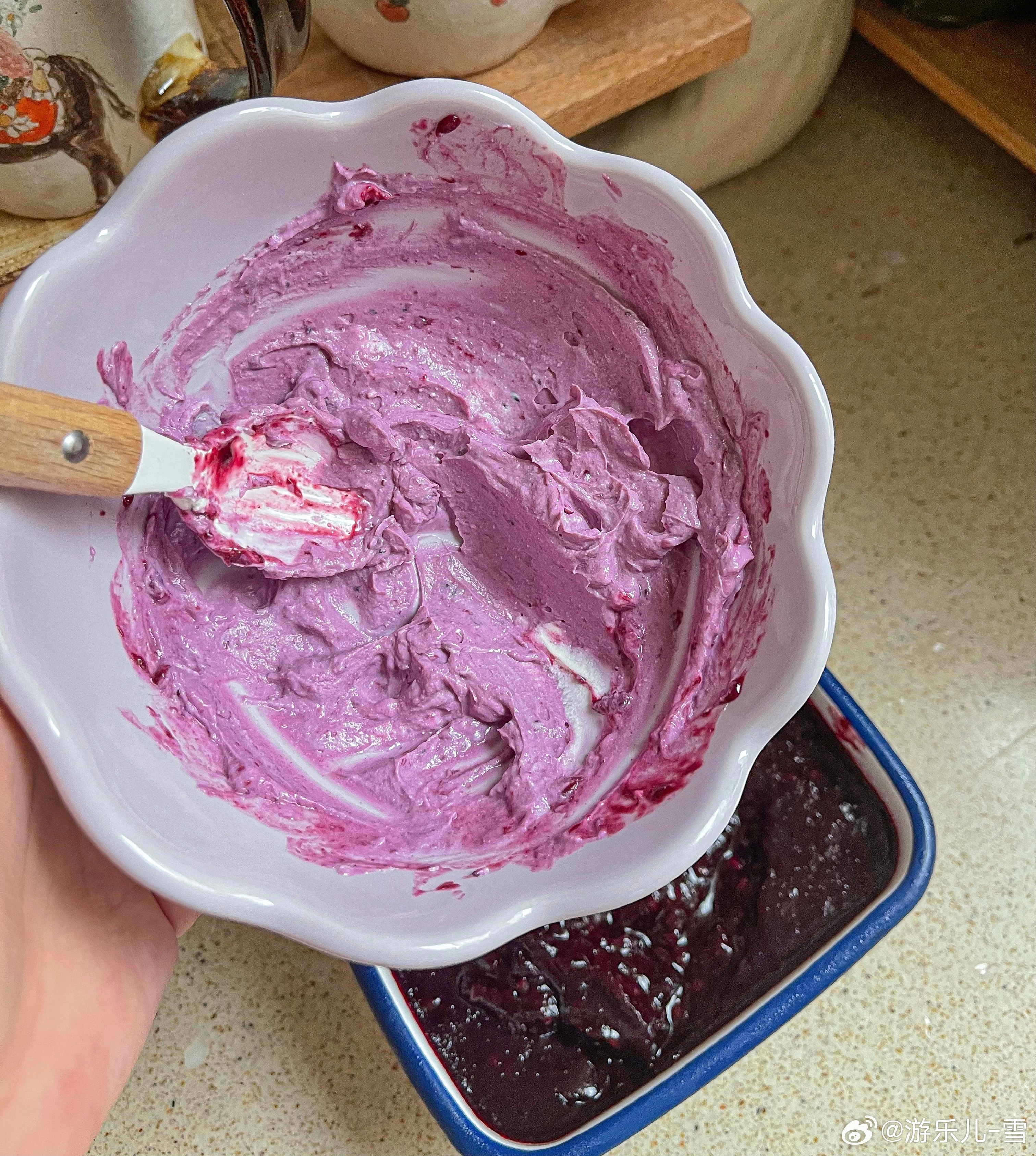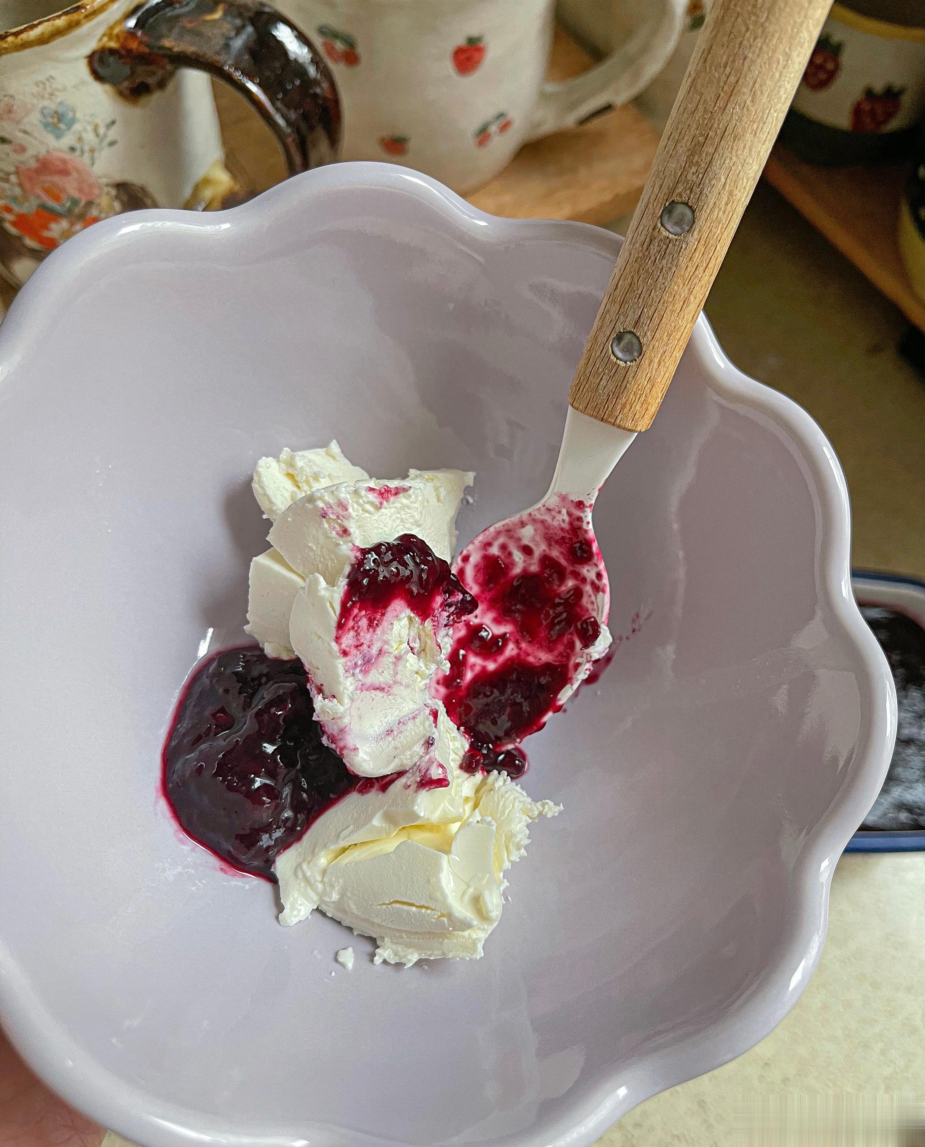 自己做的果酱和涂抹式奶酪拌在一起,抹面包吃