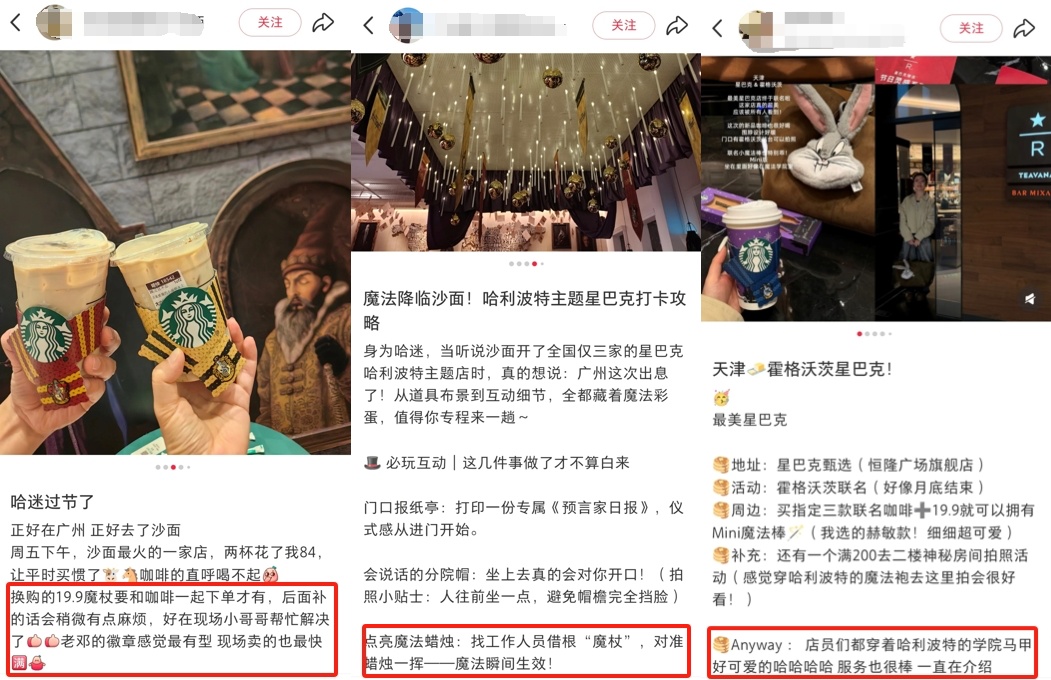 许多“哈迷”就分享到,星巴克咖啡师总会主动介绍限定饮品、周边和互动装置玩法,还有咖啡师把私藏的“巫师袍”穿到现场COS互动、向顾客借出自己的魔杖。