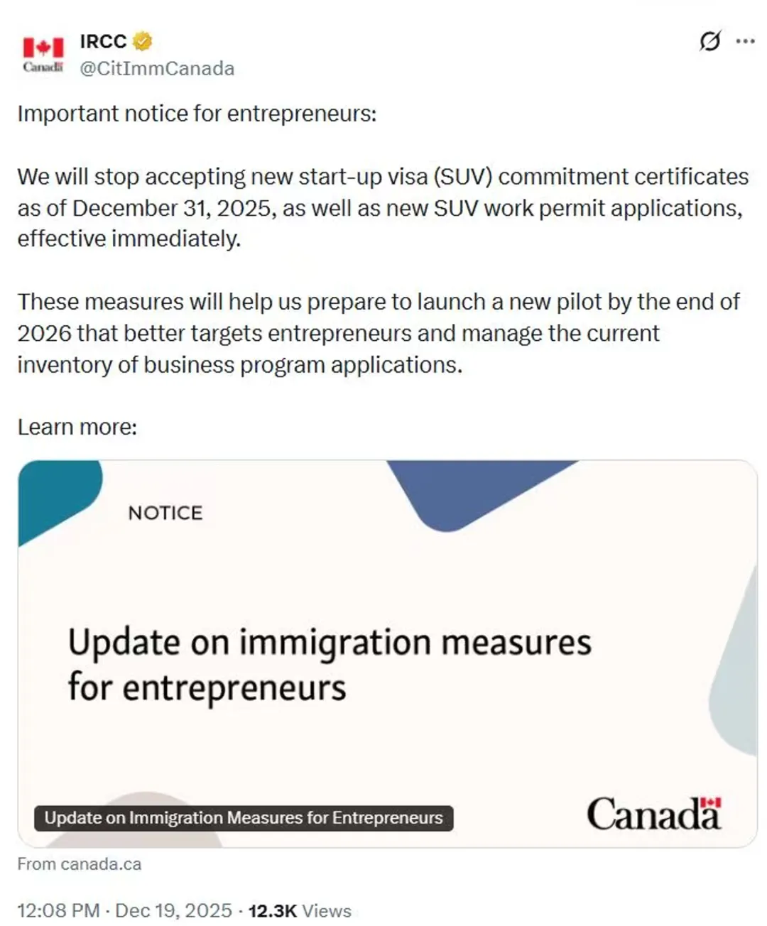 自2026年1月1日起,加拿大将暂停受理新的“创业移民计划(Start-up Visa Program,简称 SUV 项目)”申请,直至2026年底全新升级版的“SUV 2.0 版本”正式推出。