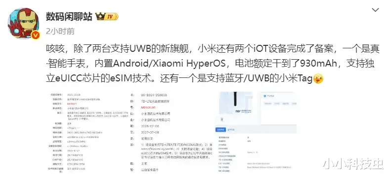 博主@数码闲聊站确认了两款新设备。其中搭载Android/HyperOS的智能手表配备930mAh电池,支持独立eSIM,可以脱离手机独立使用。