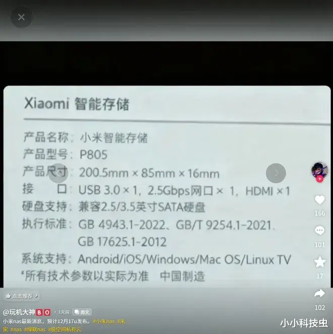 首款小米NAS智能存储即将亮相。这款产品走的是"易用"路线,兼容2.5/3.5英寸硬盘,配备2.5Gbps网口,支持全平台系统。