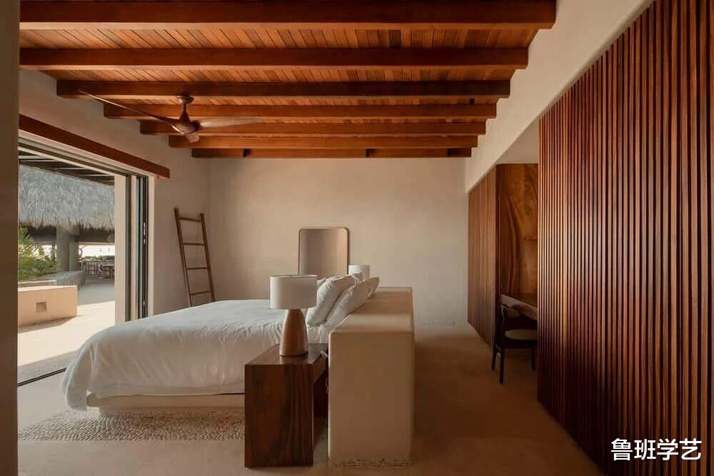 房间原木吊顶,背后还预设有书房,可以办公和休息在一个空间,而相对独立隔开,两个人也互不影响,顶面使用原木吊顶,配置架梁,墙面也用原木装饰,形成独立的小木屋,非常天然。