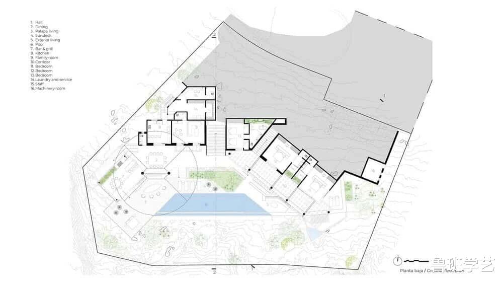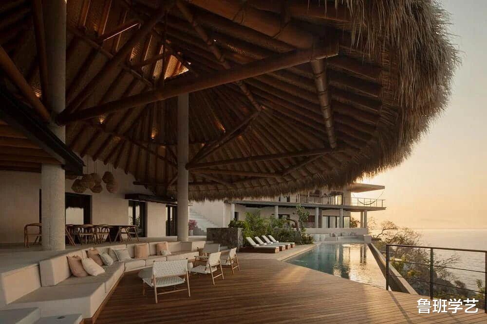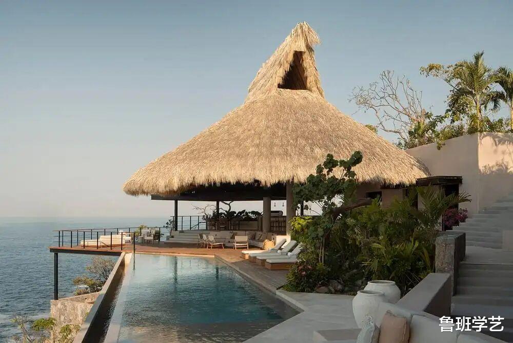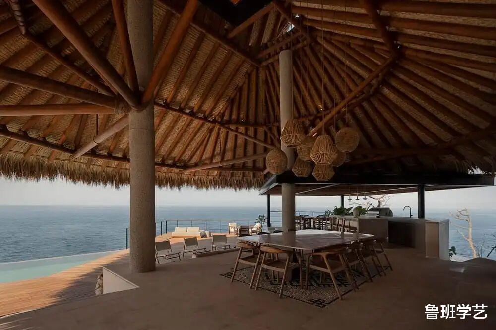 二楼配置了游泳池,休闲时候可以游泳。这个角度可以看见一个游泳池跟大海的对比,就像一个小家碧玉一样。而整个建筑被大海所“包容”,环围之势,也是非常和谐。