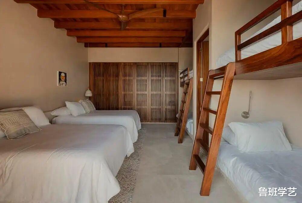 双人床结合高低床,空间最大化的利用,妥妥的八人间房间。顶面使用木质吊扇,很有地中海风格的味道。原木高低床使用与吊顶一样的色系及纹路,很协调。