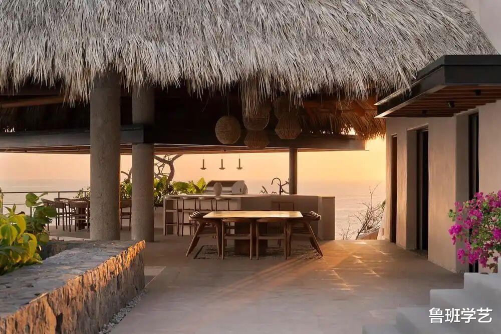 茅草屋下面是一个烧烤区,设计有吧台,水池,当然也有必备的餐桌,地面选择用毛坯石材铺装,显得很自然大气。