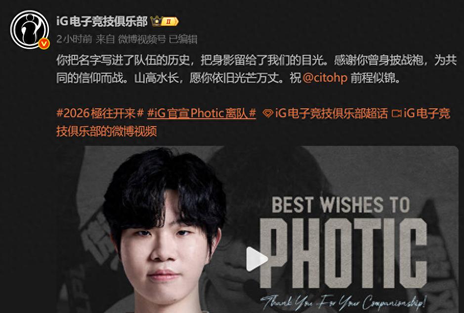 DoNews3月29日消息,3月29日晚,iG电子竞技俱乐部官方账号发布人员变动公告:确认Photic离队。iG表示:你把名字写进了队伍的历史,把身影留给了我们的目光。感谢你曾身披战袍,为共同的信仰而战。山高水长,愿你依旧光芒万丈。祝@citohp 前程似锦。