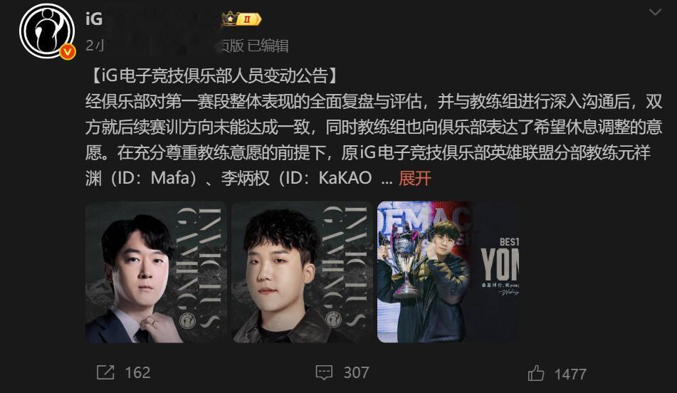 在充分尊重教练意愿的前提下,原iG电子竞技俱乐部英雄联盟分部教练元祥渊(ID:Mafa)、李炳权(ID:KaKAO)、权勇秀(ID:yongsoo)即日起正式卸任教练职务。