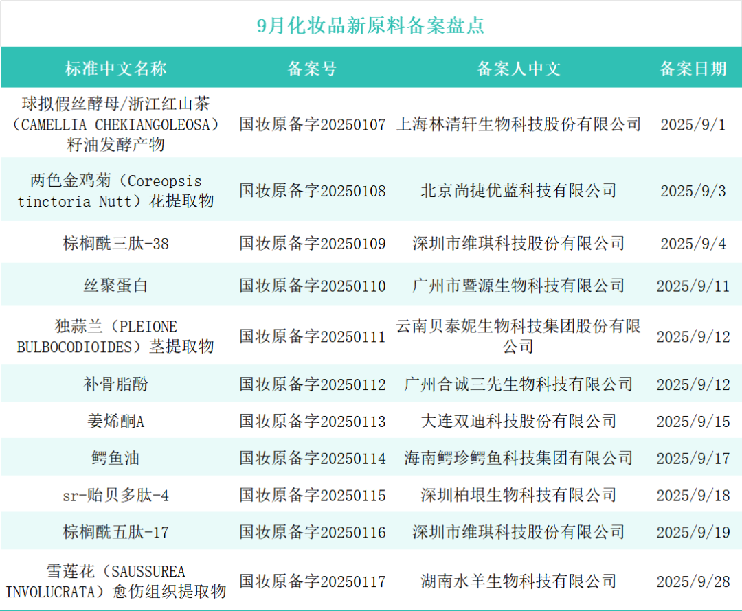 9月,国家药监局显示,化妆品新原料备案共计11个。继续呈现“肽类抗老 + 发酵/植萃 + 功效油脂”三线并进的结构性特征。头部国货企业与功效原料商同时现身,林清轩、贝泰妮、水羊等品牌方自研(或关联主体)素材进入备案名单,维琪科技等原料公司则在肽类赛道持续加码。