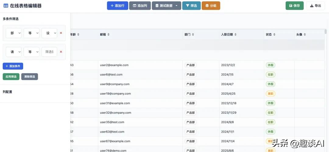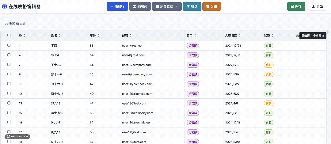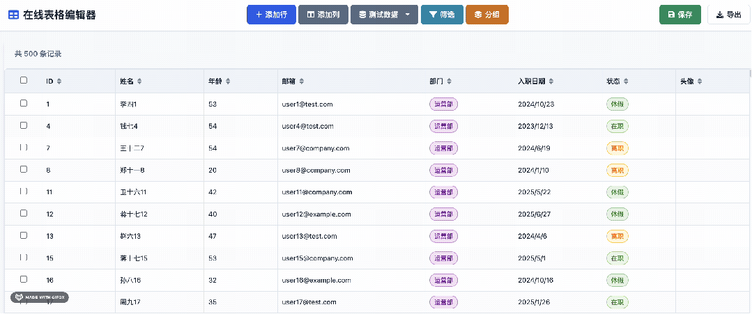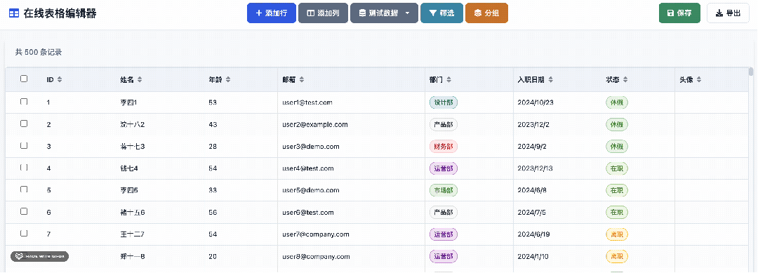 这款在线表格编辑器支持多条件筛选、分组展示、批量多选、图片上传与压缩、导出为 CSV/JSON、本地持久化、快捷键等特性。在 VTable 可用时启用增强型表格能力;在不可用时自动降级为简化版 HTML 表格,保障核心编辑体验。