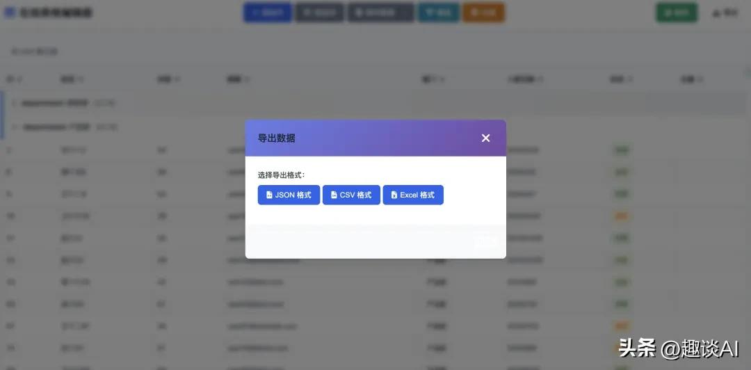 6. 导出能力目前我也实现了表格的数据导出能力,比如导出json,导出CSV格式的文件: