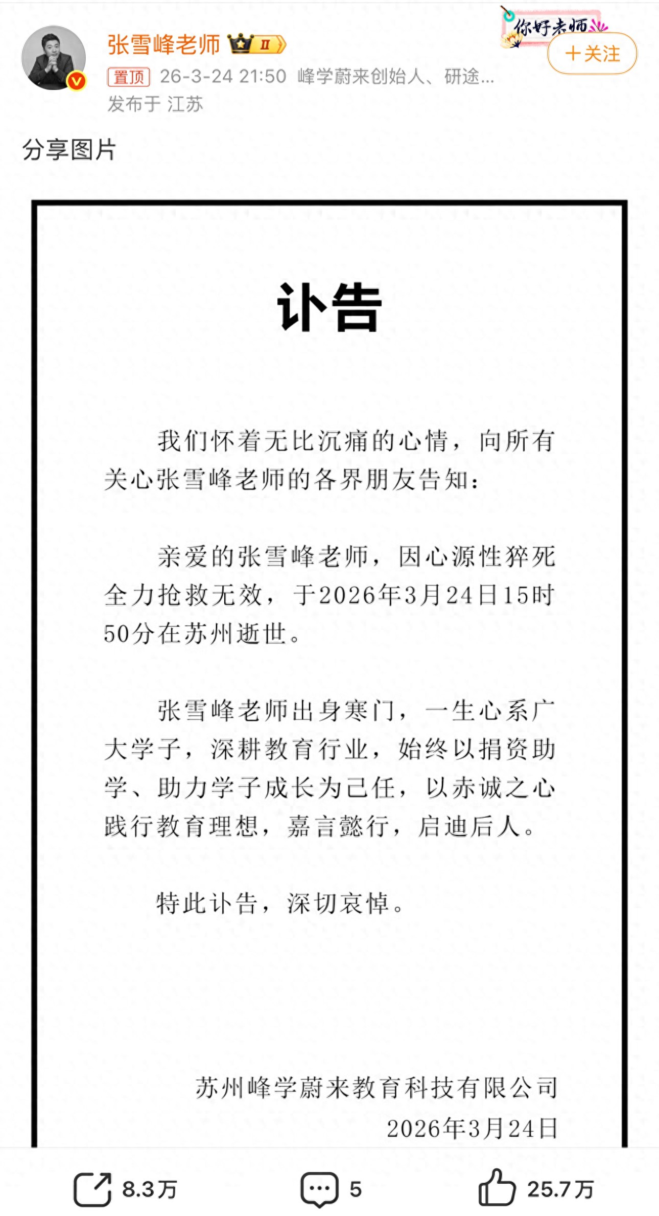 这两天,张雪峰老师猝死的消息,让全网为之惋惜。41岁的人,早上还在直播,中午在公司跑步后突发不适,被紧急送医抢救,仍在下午3点50分不幸离世。医院诊断,死亡原因正是心源性猝死。