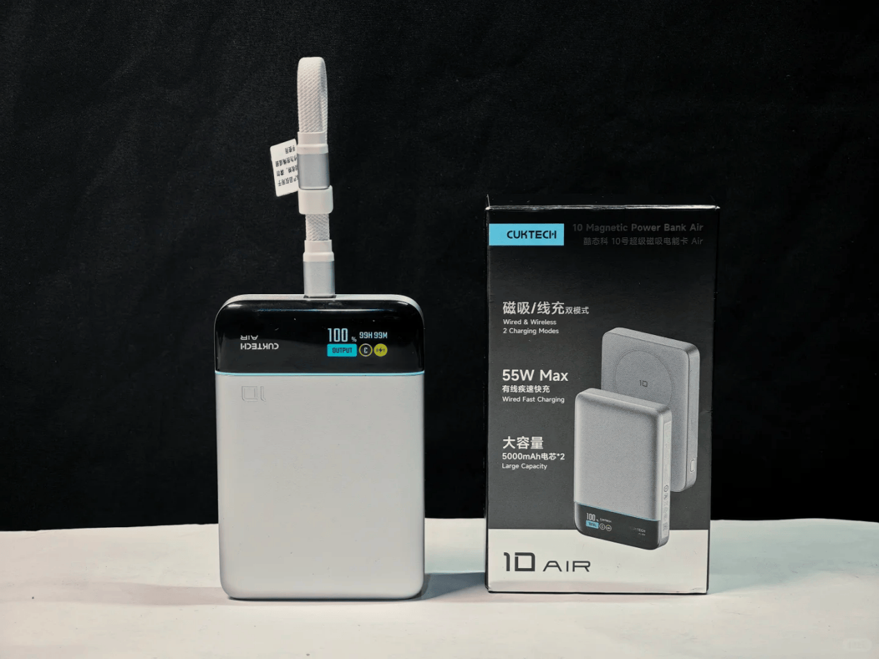 酷态科 10号 Air 配备 15 颗 N56 磁铁和液态硅胶设计,在磁吸充电时对齐比较精准,短时间内为手机补电体验较为稳定。自带可拆卸 Type-C 数据线,临时应急使用较方便。TFT 高清万象屏可以显示电量和充电状态,信息直观,即便在光线较暗环境下也能清楚查看。