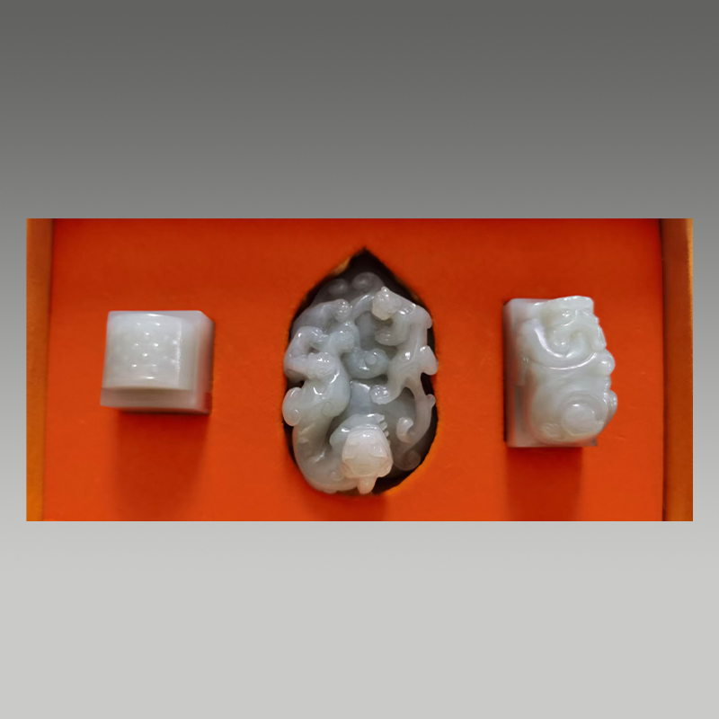 这玉套组质润泽丰,中心葫芦瑞气缭绕,两侧方章规整大气,雕工精细传神,尽显典雅华贵之风