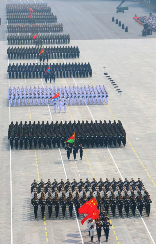 今天的天安门广场,党旗,国旗,军旗在风中猎猎飞扬,飒爽英姿的部队方阵,整齐划一地踢着正步走过天安门城楼,国之重器惊艳亮相,空中战机轰鸣而过,26架直升机组成巨大的“80”字样,3架直升机分别悬挂“正义必胜”、“和平必胜”、“人民必胜”的巨大条幅,向全世界宣示中国主张!