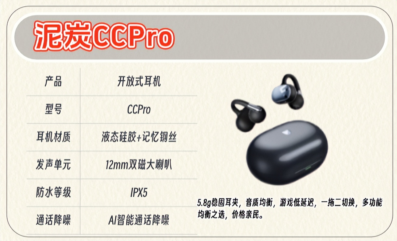 购买建议如果你想要一款既能满足运动佩戴需求,又能兼顾日常听歌、玩游戏的多功能开放式耳机,泥炭CCPro是绝佳选择,它没有明显短板,每一项功能都能精准匹配需求,而且价格也十分亲民。