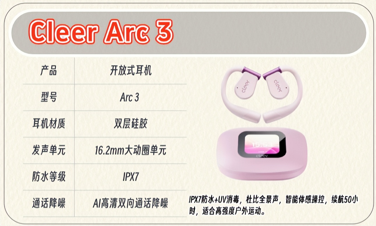 要是你是高强度运动爱好者,或是对音质与智能功能有高要求,Cleer Arc 3的IPX7防水、UV-C消毒与杜比全景声,能完美匹配你的需求,只是重量对小耳廓用户不太友好。