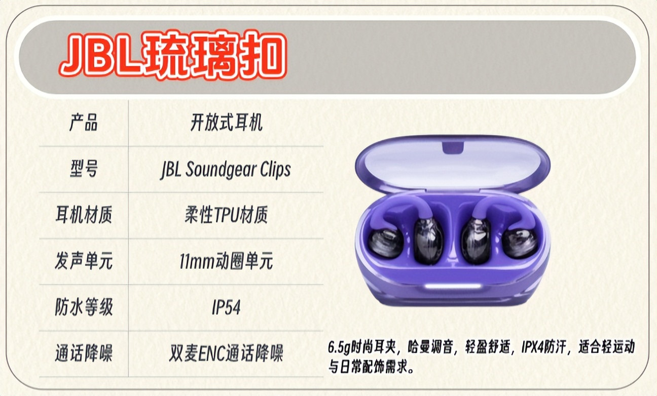 而如果你更看重时尚外观与佩戴舒适,日常仅需满足轻运动、通勤需求,JBL琉璃扣会是合适的选择,它既是耳机也是配饰,只是音质与防水性表现一般。