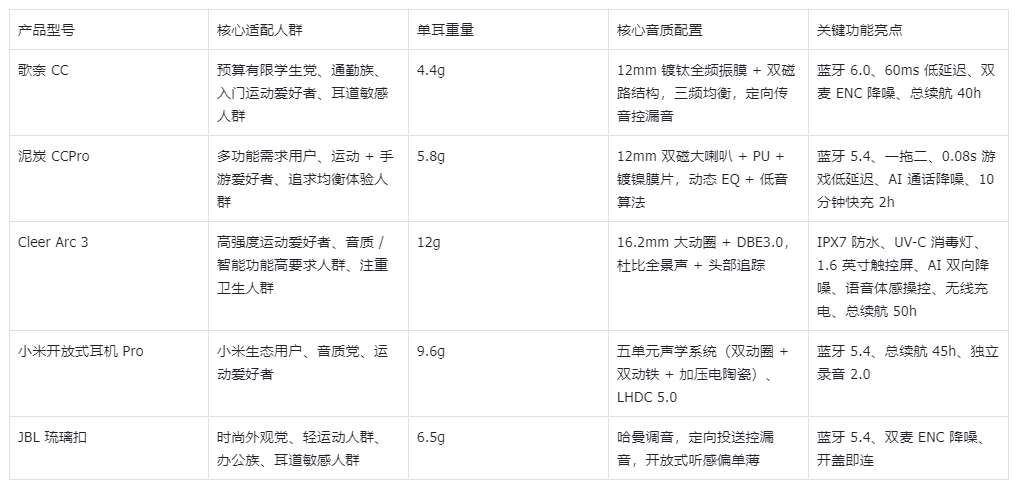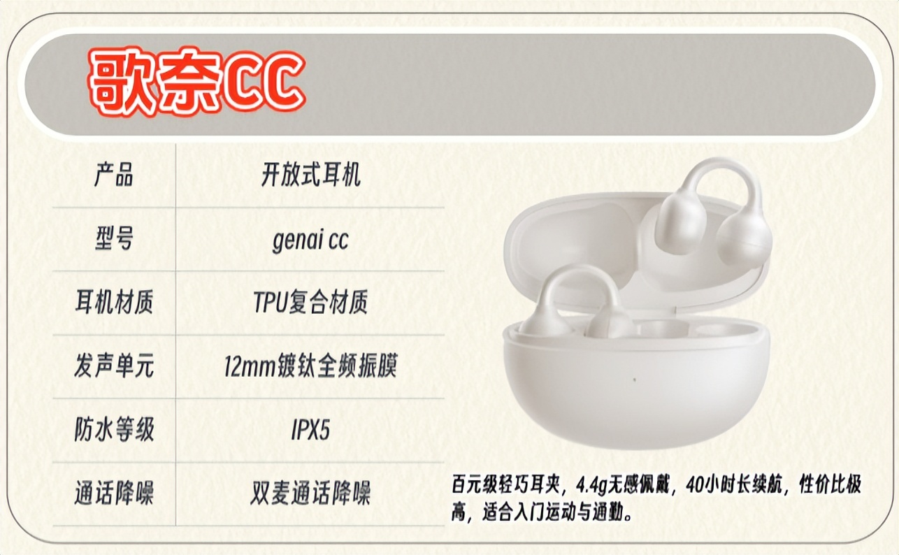 如果你追求极致性价比,需要兼顾日常通勤与轻度运动,选择歌奈CC即可,百元价位就能将开放式耳机的核心优势拉满,完全无需纠结。