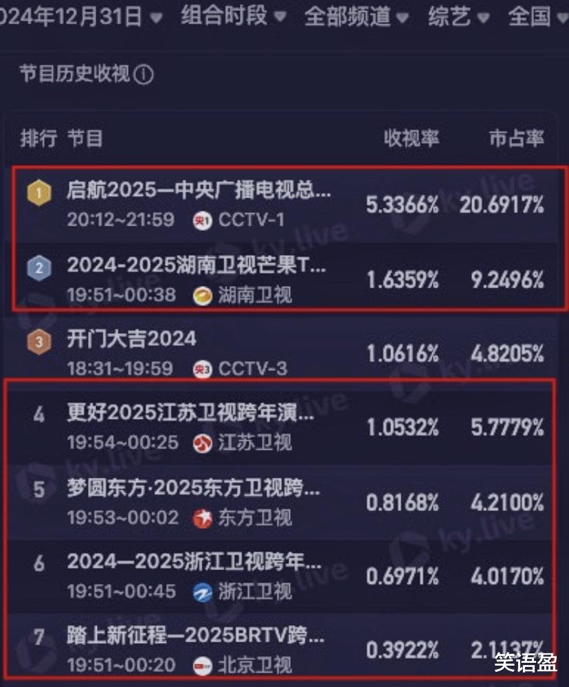 在六大贺岁节目中,央视最终以5.33%的收视率和20.69%的市场份额夺得跨年收视冠军。