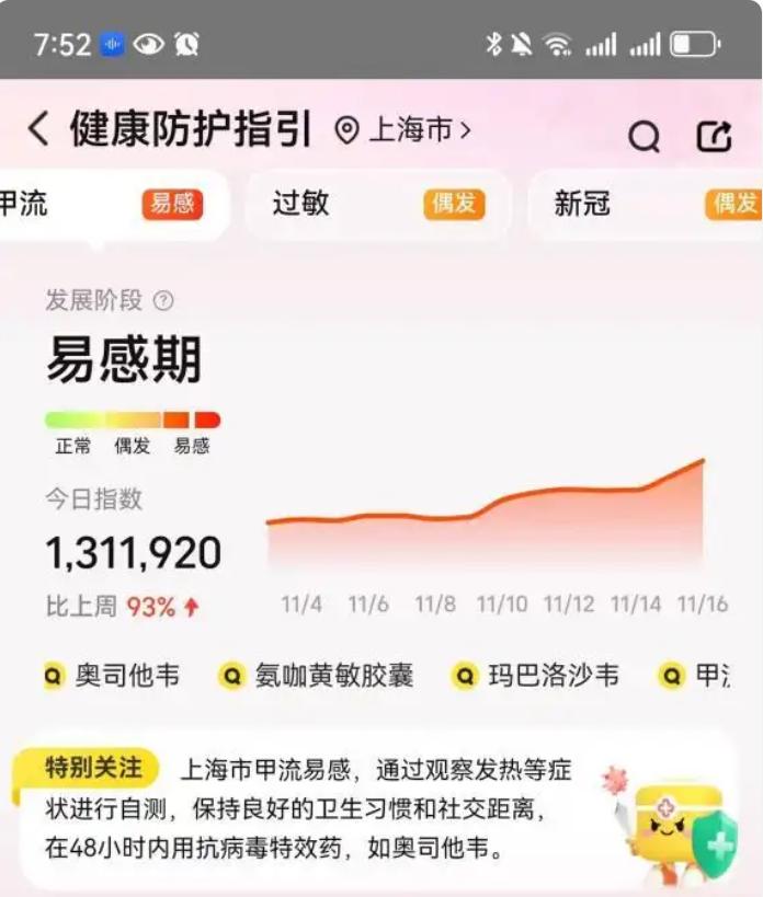 美团买药数据显示,近期南北方易感指数大幅提升,部分城市较上周增幅接近翻倍。同时,11月以来平台流感相关药品订单量环比增长也超1倍,其中感冒灵颗粒、小柴胡颗粒、西瓜霜、川贝枇杷膏等中成药长期占据月度销量榜单前列。