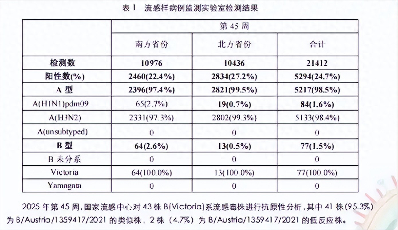 与去年同期相比,今年流感呈现“流行早、增速快、北方强”的特征。往年流感季多始于11月中下旬,而今年10月下旬华南、西南等地区已进入中流行水平。监测数据显示,2025年第45周,北方省份哨点医院报告的ILI%为6.1%,超过南方省份哨点医院报告ILI%的5.5%,且高于2022年、2023年和2024年同期水平(2.0%,4.9%和3.6%)。但流行强度仍在持续上升,国家疾控中心预测12月中下旬至1月初将迎来疫情高峰。