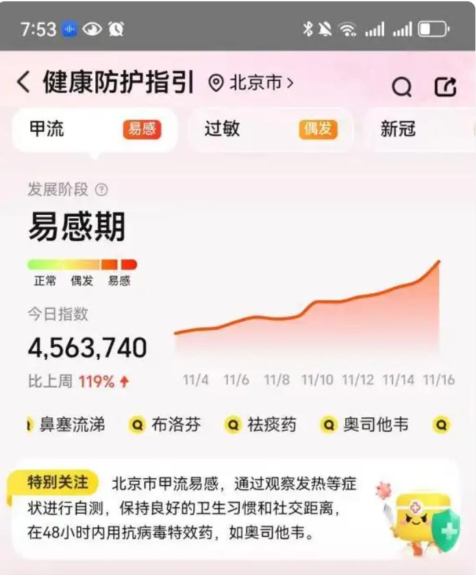 进入冬季,全国多地气温骤降,流感病毒活动水平呈“爆发式”增强。中国疾控中心最新发布的流感监测周报显示,当前新型冠状病毒感染人数持续下降,但流感病毒感染病例显著上升,其中甲型H3N2亚型占比超98%,成为绝对主导毒株。由于居民对该毒株普遍缺乏免疫力,今年冬季流感高发期较往年提前约1个月,防控形势备受关注。