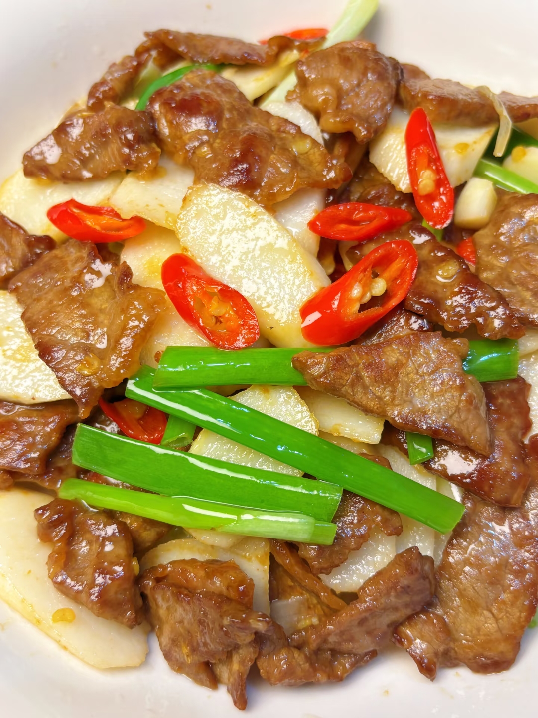 一切准备就绪,接下来就是炒制的环节了。热锅凉油,油温五成热时,下入腌制好的牛肉片,快速翻炒,待牛肉变色后迅速盛出,避免炒老。锅中留底油,放入山药片,中火翻炒至山药片边缘微微透明,这时候的山药已经变得软糯可口。接着,将之前炒好的牛肉重新倒入锅中,与山药一起翻炒均匀,让两者的味道充分融合。此时,可以加入适量的盐调味,再撒入红椒丝和葱段,快速翻炒几下,让红椒的辣味和葱的香味完美融入菜中。