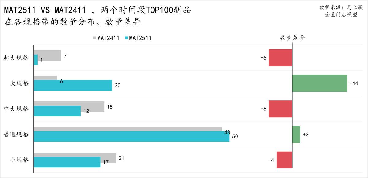 在规格带分布上,我们将所有TOP100新品的规格进行了区间落位,共分为5个区间对应不同的主流消费场景,各区间的范围为:小规格(0-399ml)、普通规格(400ml-699ml)、中大规格(700ml-999ml)、大规格(1000ml-1999ml)、超大规格(2000ml+)。