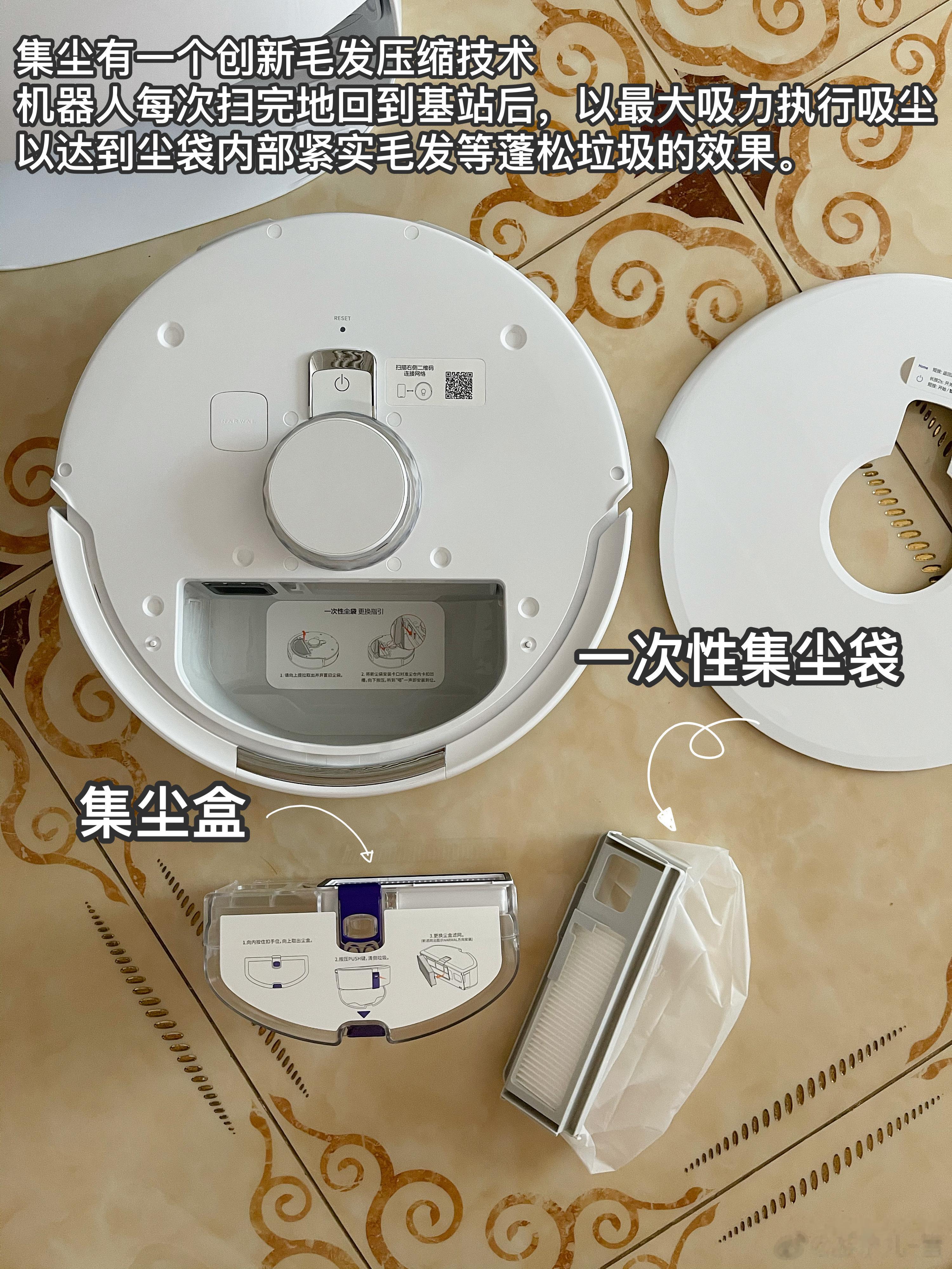 1.集尘有一个创新毛发压缩技术,机器人每次扫完地回到基站后,以最大吸力执行吸尘,以达到尘袋内部紧实毛发等蓬松垃圾的效果。