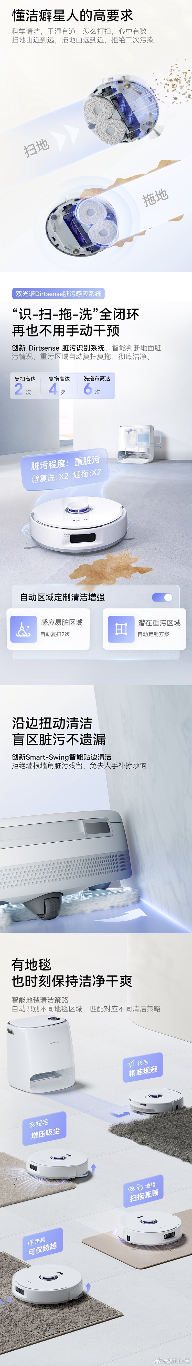 [礼物]升级四:智能地毯清洁,轻松应对各种地毯:遇到短毛地毯抬起,拖布增压吸尘,长毛精准规避,地垫扫拖兼顾。