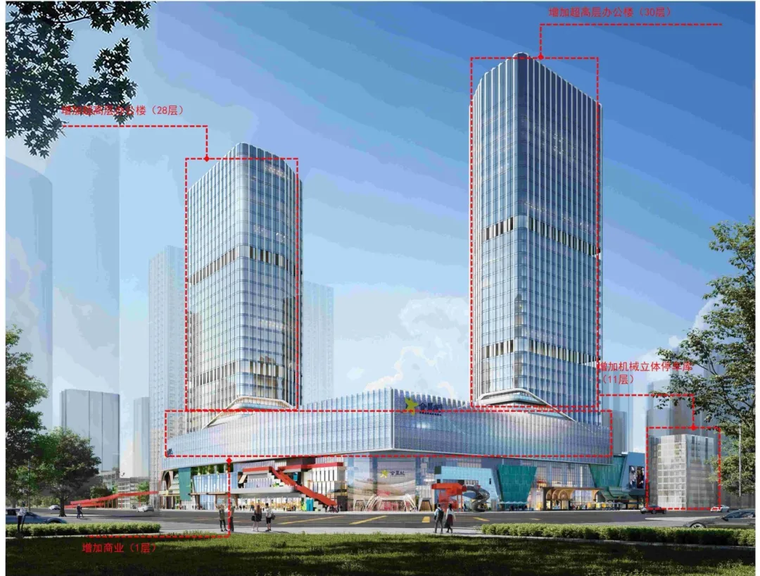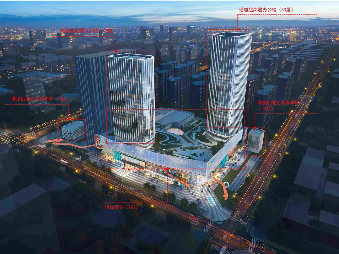 同时东侧加建一栋28层办公楼,北侧加建一栋30层办公楼,主打五星级酒店、高端写字楼以及服务式公寓等业态,有效填补区域高端酒店与甲级办公的市场空白
