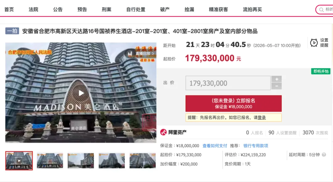 高新区国祯养生酒店也在拍卖挂牌价1.79亿,不过截至发稿时,还无人报名。