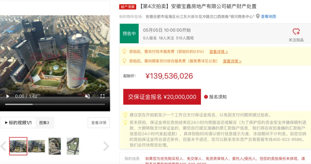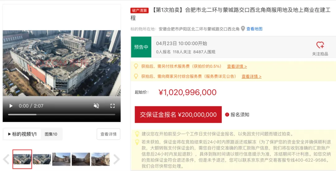 合肥市北二环与蒙城路交口西北角商业用地及地上商业在建工程(即“合肥苏宁广场”)最新上架京东司法拍卖,预告将于4月23日进行第一次拍卖,起拍价10.2亿元。