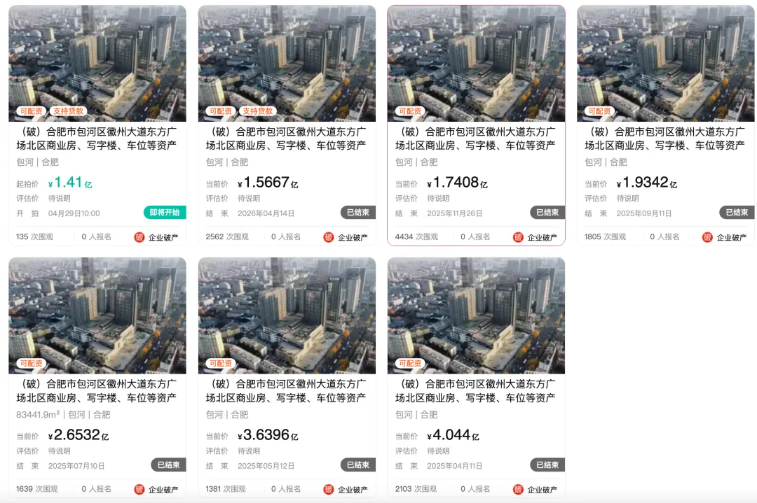 包河区的东方广场北区资产又一次降价拍卖。该项目从4.044亿一路下降至1.41亿元。