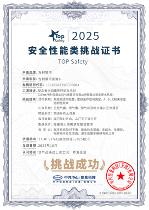 近期,吉利银河星耀6一次性通过中汽中心举办的行业首个超国标整车安全四重连环炼狱挑战,包括速度超现行标准16%的正面刮底碰撞、60km/h偏置正面碰撞、2.1倍国标能量的侧面碰撞及3倍国标深度的浸水测试,全面验证了从电池安全到车身结构稳定性的全维度安全实力,展现出在极端复合风险场景下的高安全冗余。
